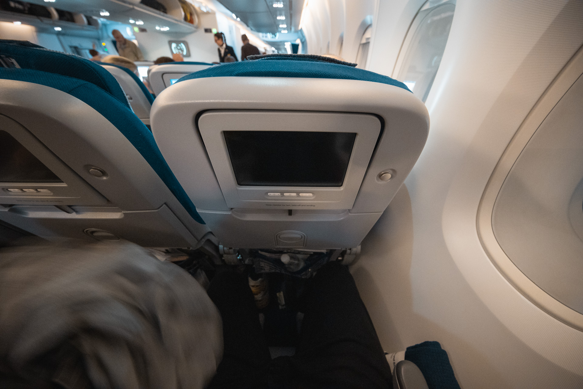 The crew made a good first impression, they seemed very friendly. When we made it to our seats, 83J and 83K, respectively, I was impressed by the size of the cabin. Everything feels very spacious, especially when sitting at a window seat. The fuselage still curves outwards, so you get lots of room between the seat and the fuselage, perfect for me.