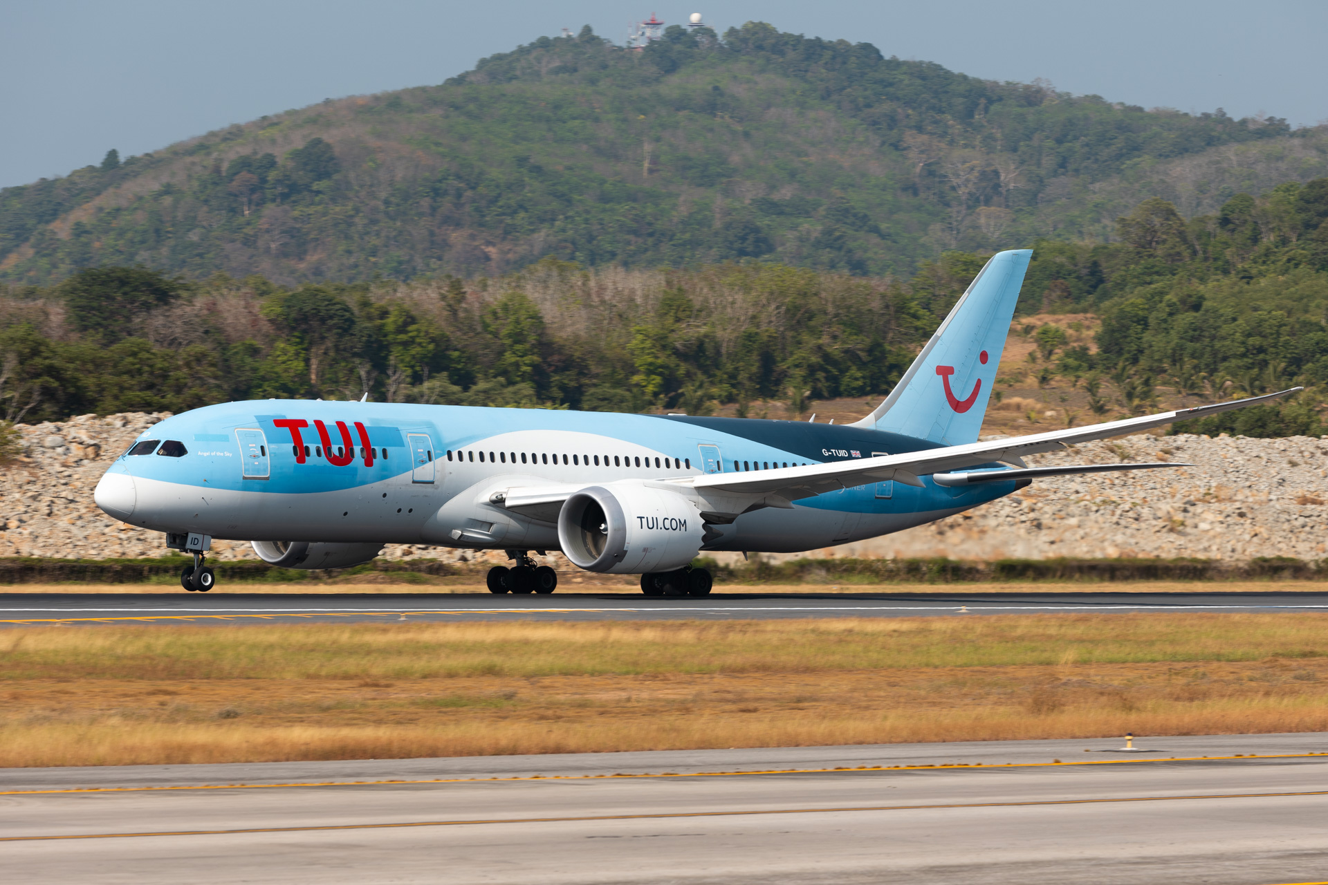 A Tui Airways Boeing 787-8, registered as G-TUID taking off from runway 27
