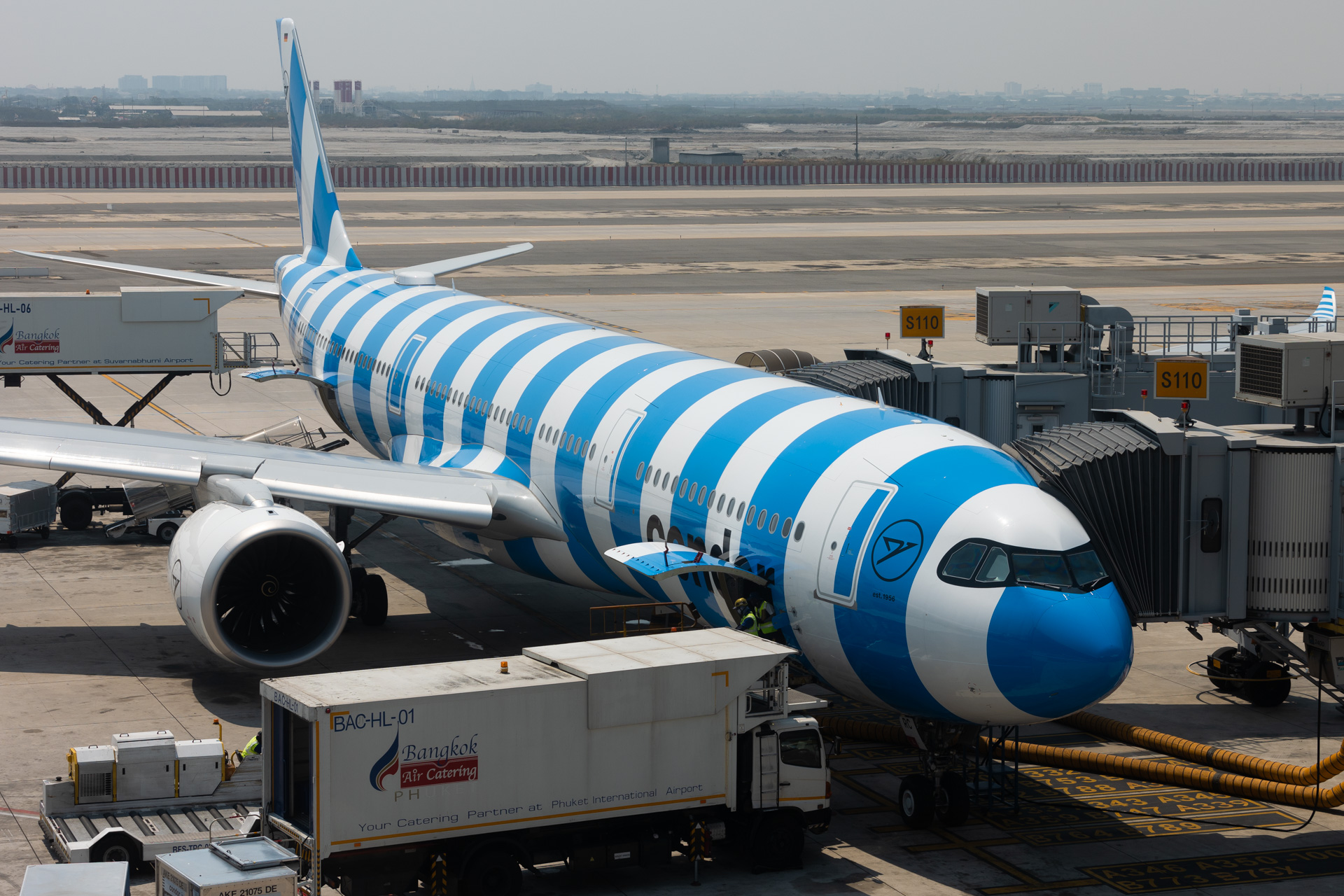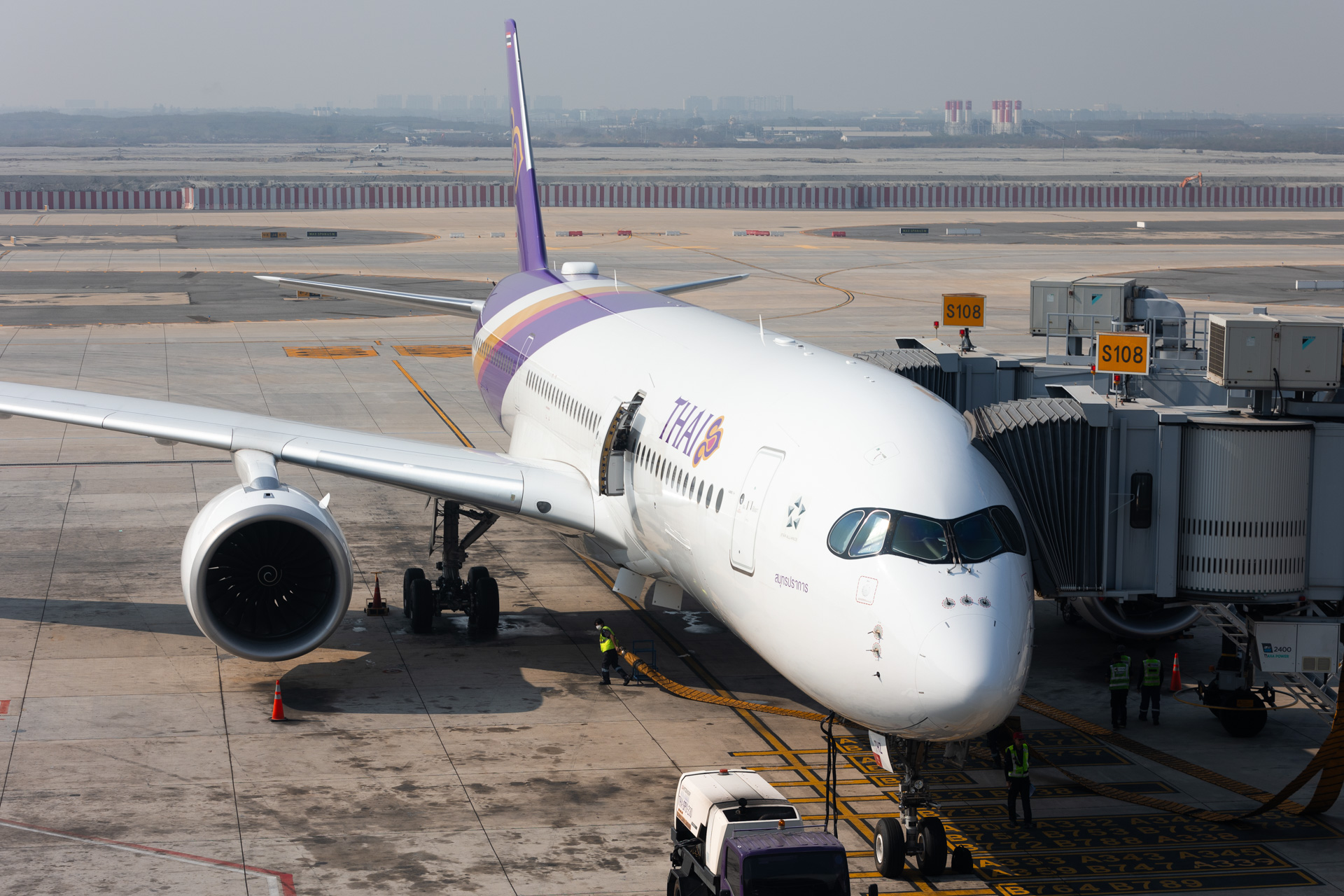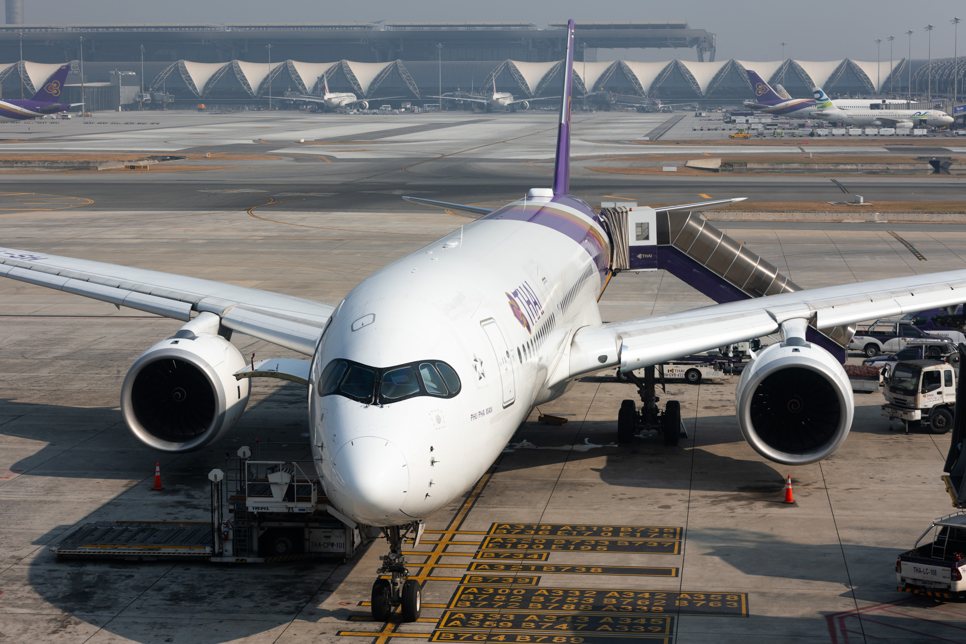 A Thai Airways Airbus A350-941, registered as HS-THZ resting at the gate