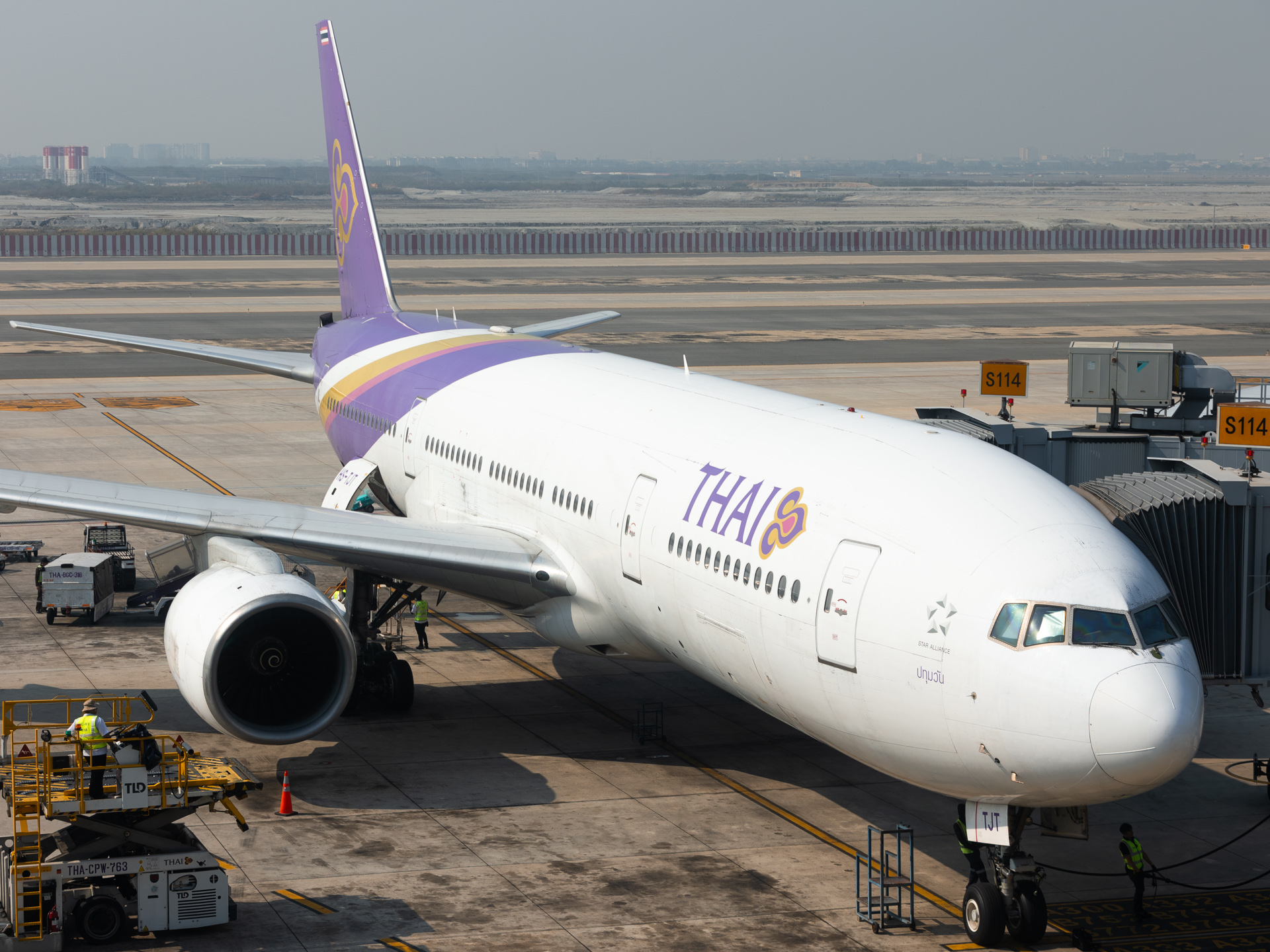 A Thai Airways Boeing 777-2D7(ER), registered as HS-TJT resting at the gate