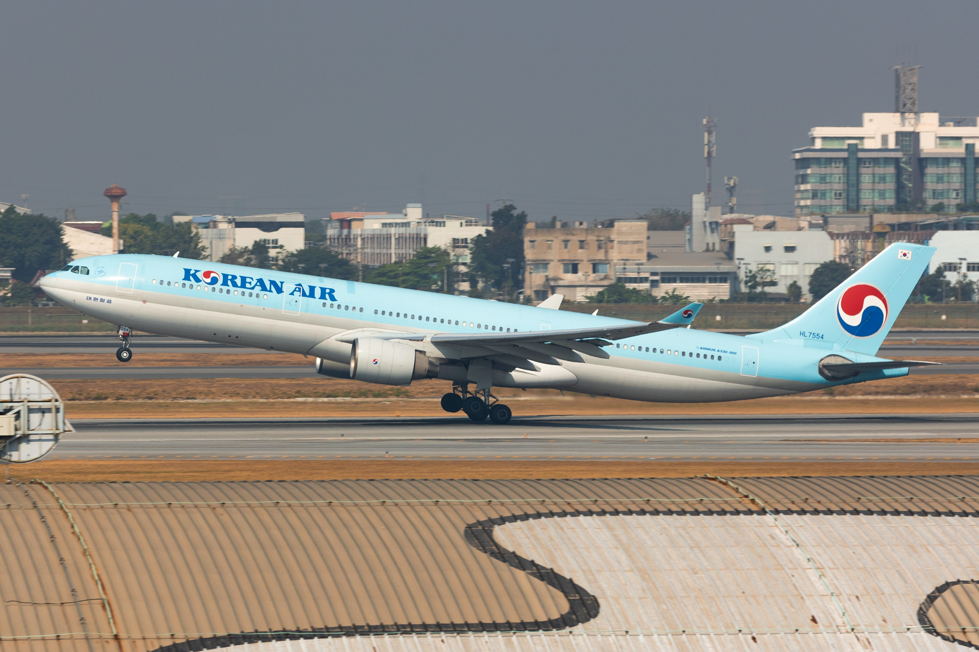 A Korean Air Airbus A330-323, registered as HL7554 taking off
