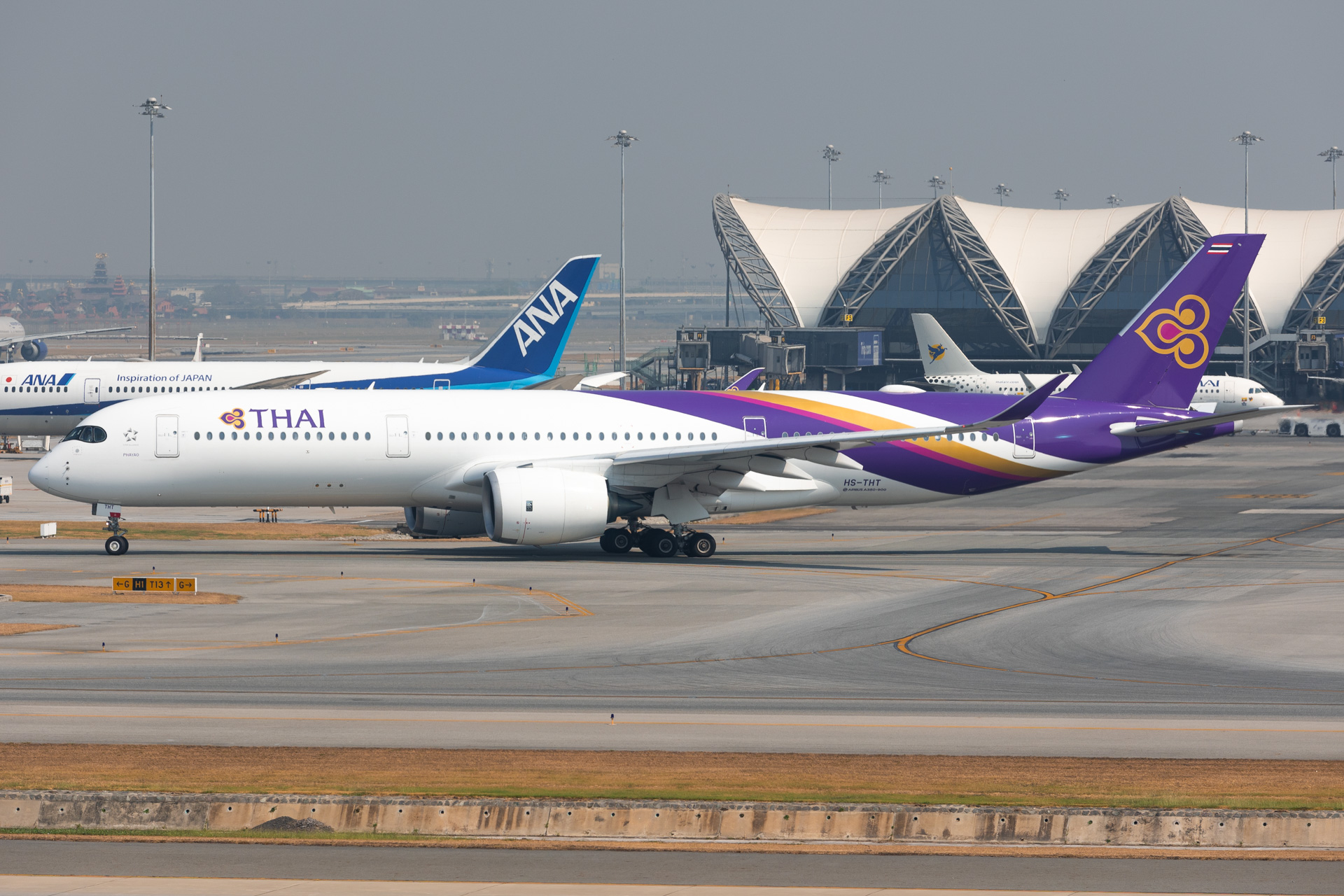 A Thai Airways Airbus A350-941, registered as HS-THT taxiing to the active ruwnay