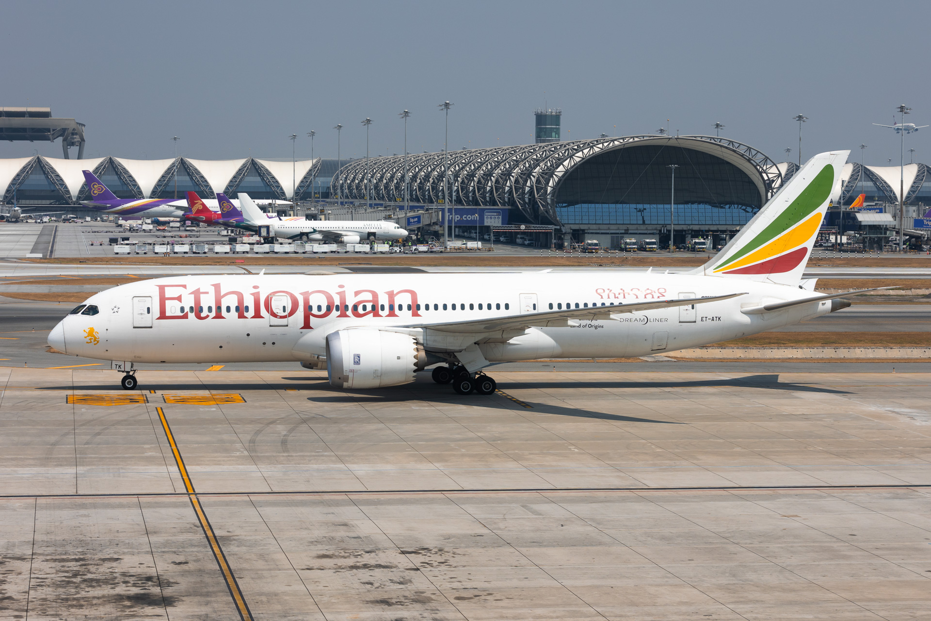 An Ethiopian Airlines Boeing 787-8, registered as ET-ATK taxiing to the gate