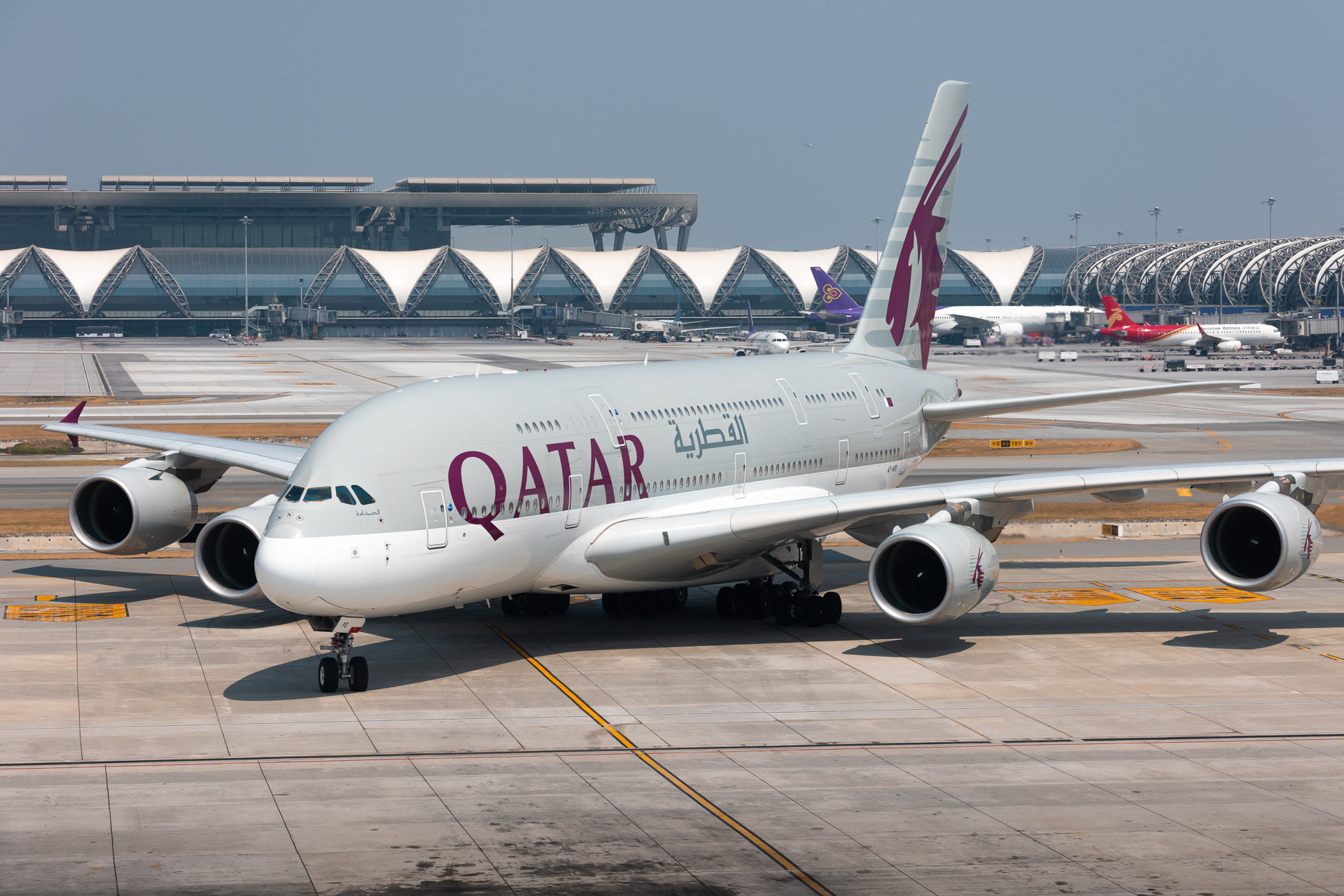 A Qatar Airways Airbus A380-861, registered as A7-APD taxiing to the gate