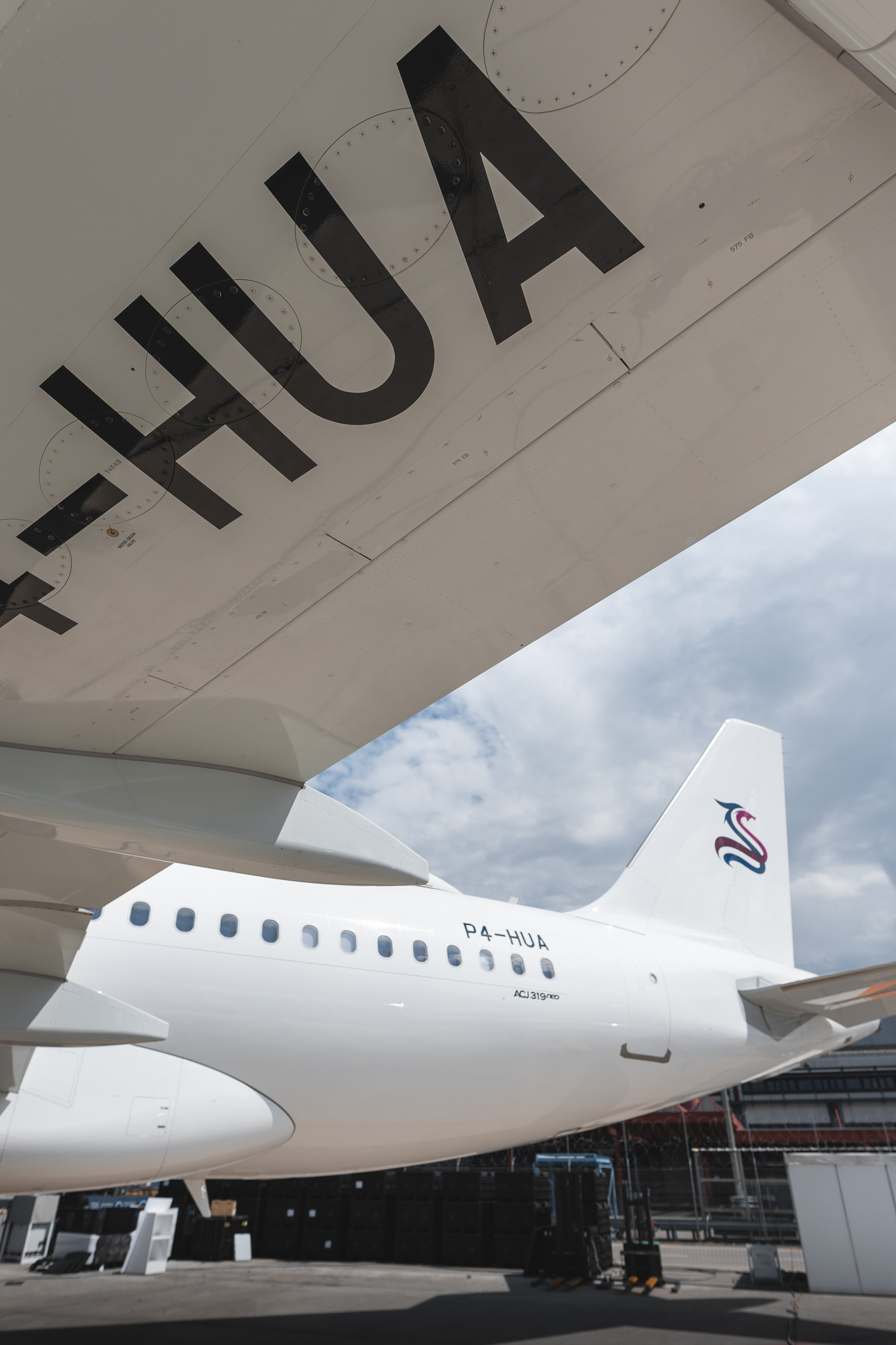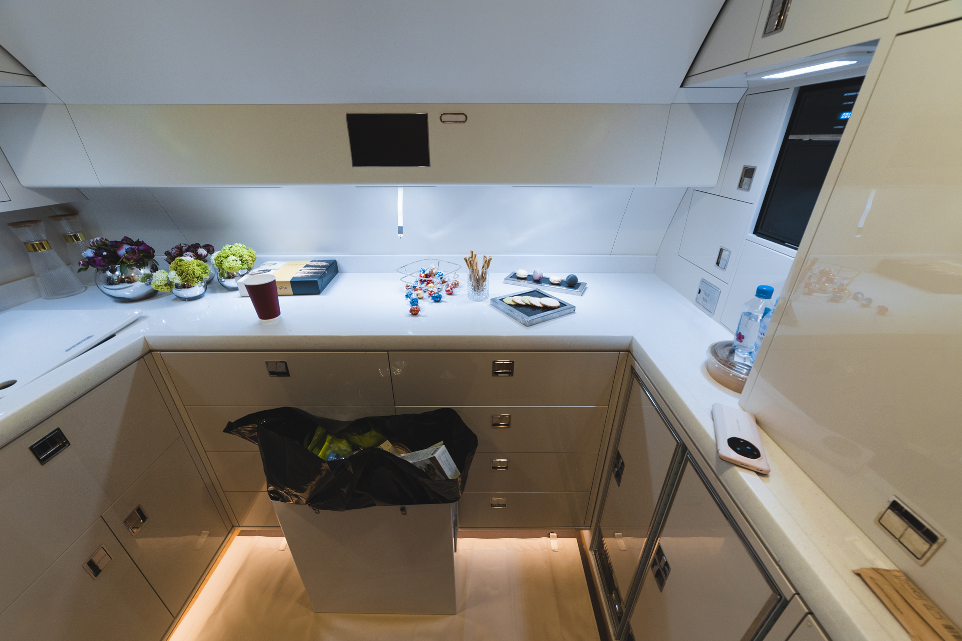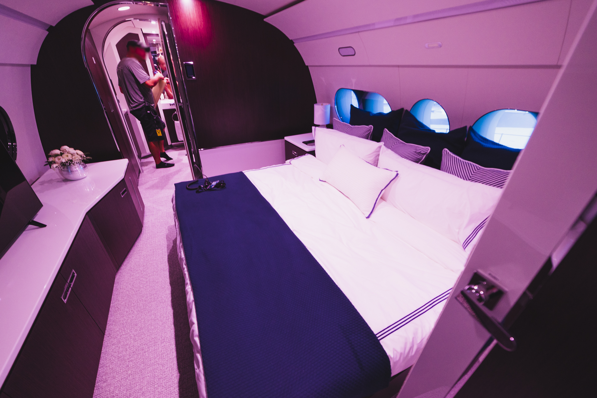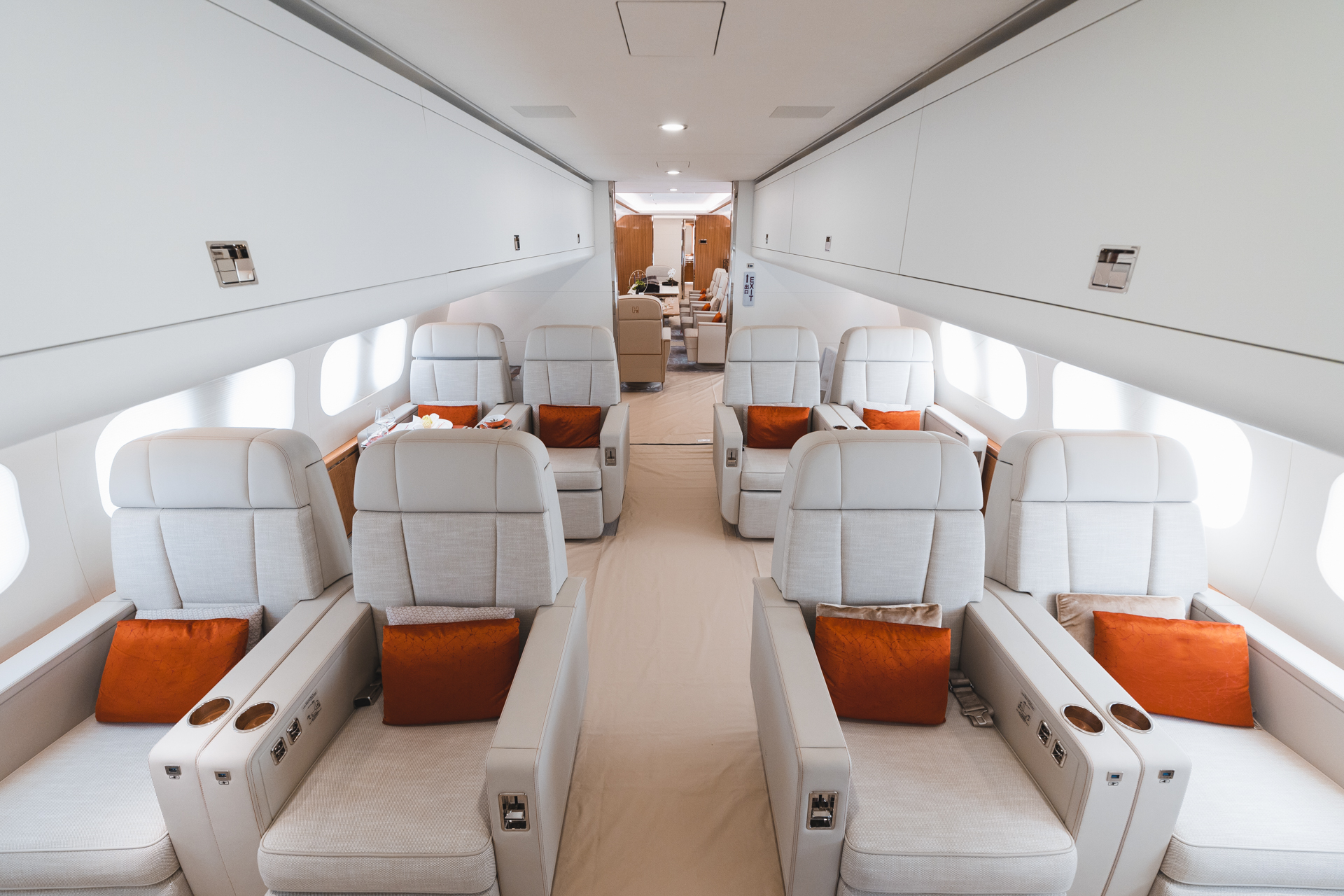 Naturally, I was not the sole reporter eager to witness the ACJtwotwenty firsthand, both inside and out. Just moments before the conclusion of the day's activities, as the aircraft was about to be closed for public, I managed to seize a precious few minutes to capture the stunning interior and marvel at the cabin's lighting system.