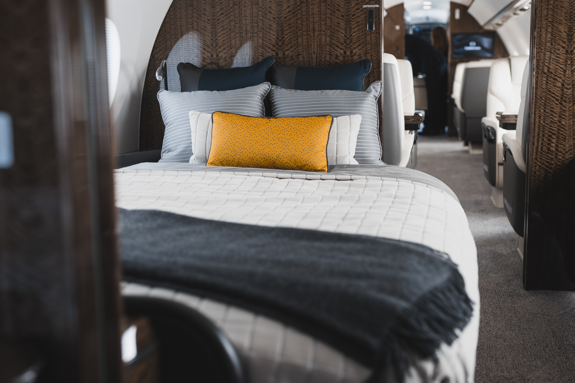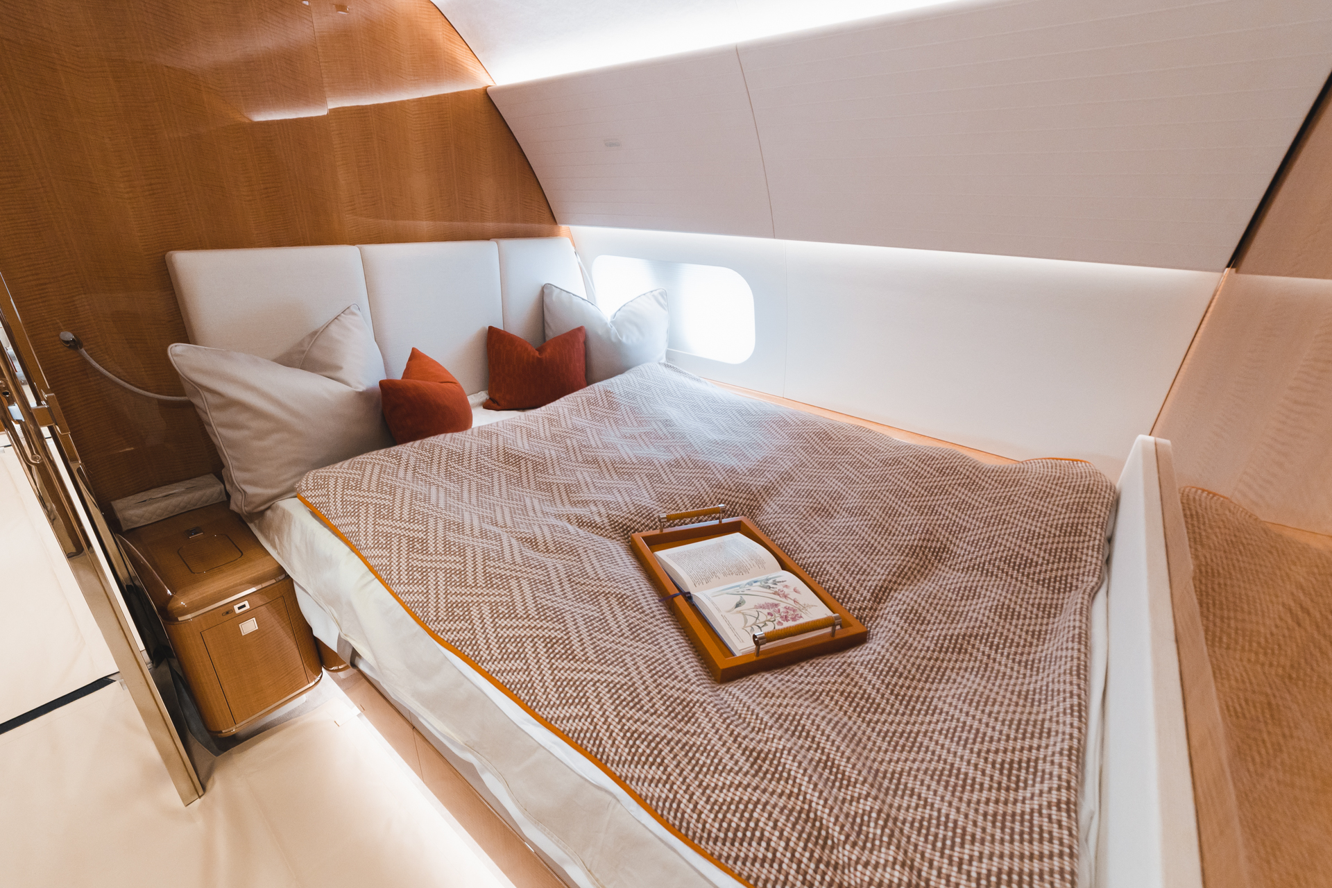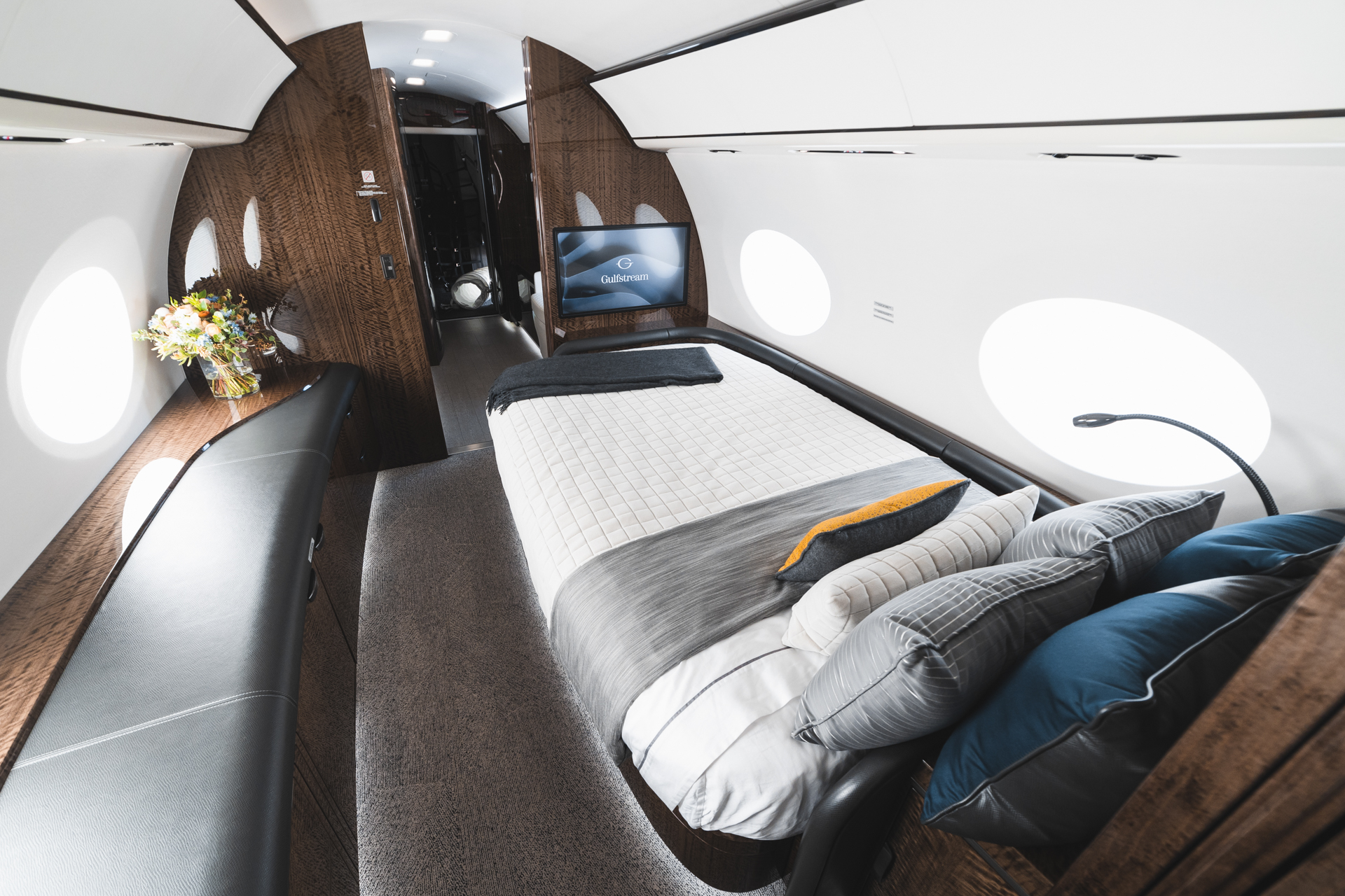 Fortunately, Gulfstream presented a different G700 this year, surpassing the interior elegance of the one presented last year, in my opinion. This particular G700, the second one to roll off the production line is utilized by Gulfstream for promotional endeavors, boasts a generous living space adorned with a sumptuous couch and a television. Beyond the living area, an exceptional attribute awaits — a fixed bed, a rarity among purpose-built business jets, yet a truly remarkable feature, in my estimation. To further elevate its allure, a petite bathroom lies behind the bedroom, complete with a fully functional shower — a remarkable addition indeed.