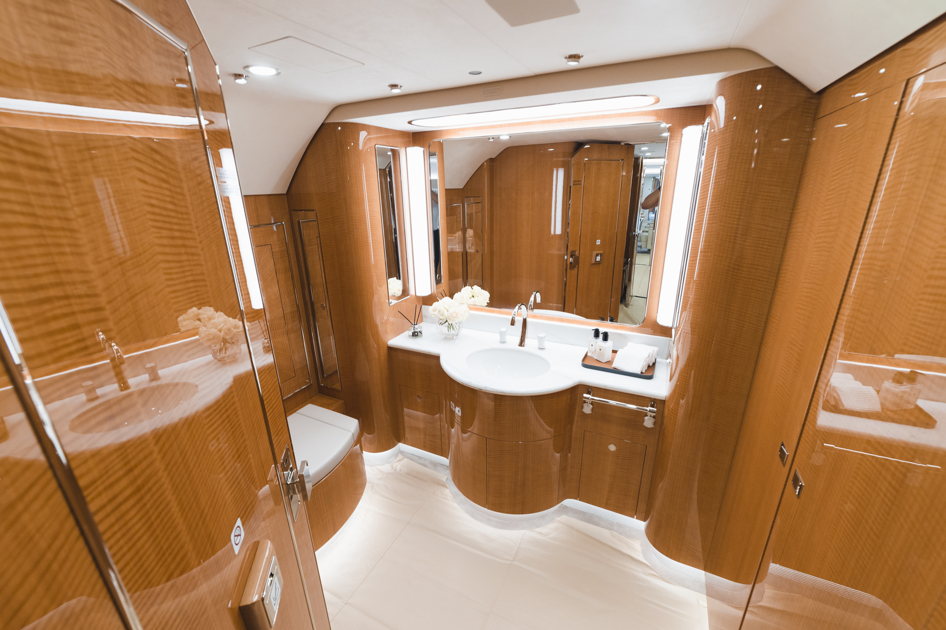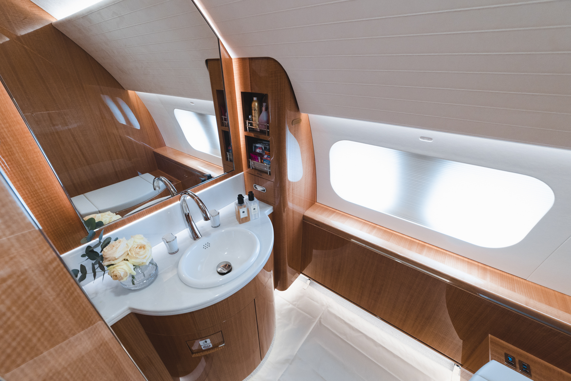 This G650ER, also a distinguished customer aircraft, boasted a resplendent and luminous interior. It captivated me with its departure from the customary beige and brown color scheme, opting for a more enchanting palette. The aircraft showcases an exquisite TV room and a breathtaking lavatory situated at the rear, showcasing the epitome of elegance.