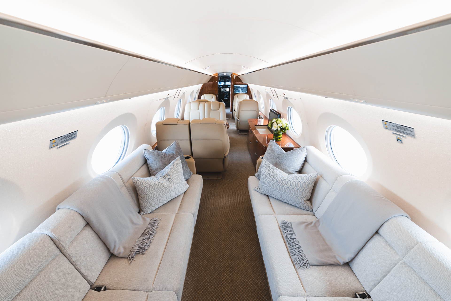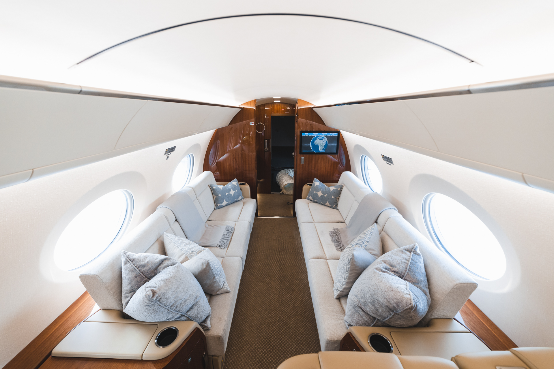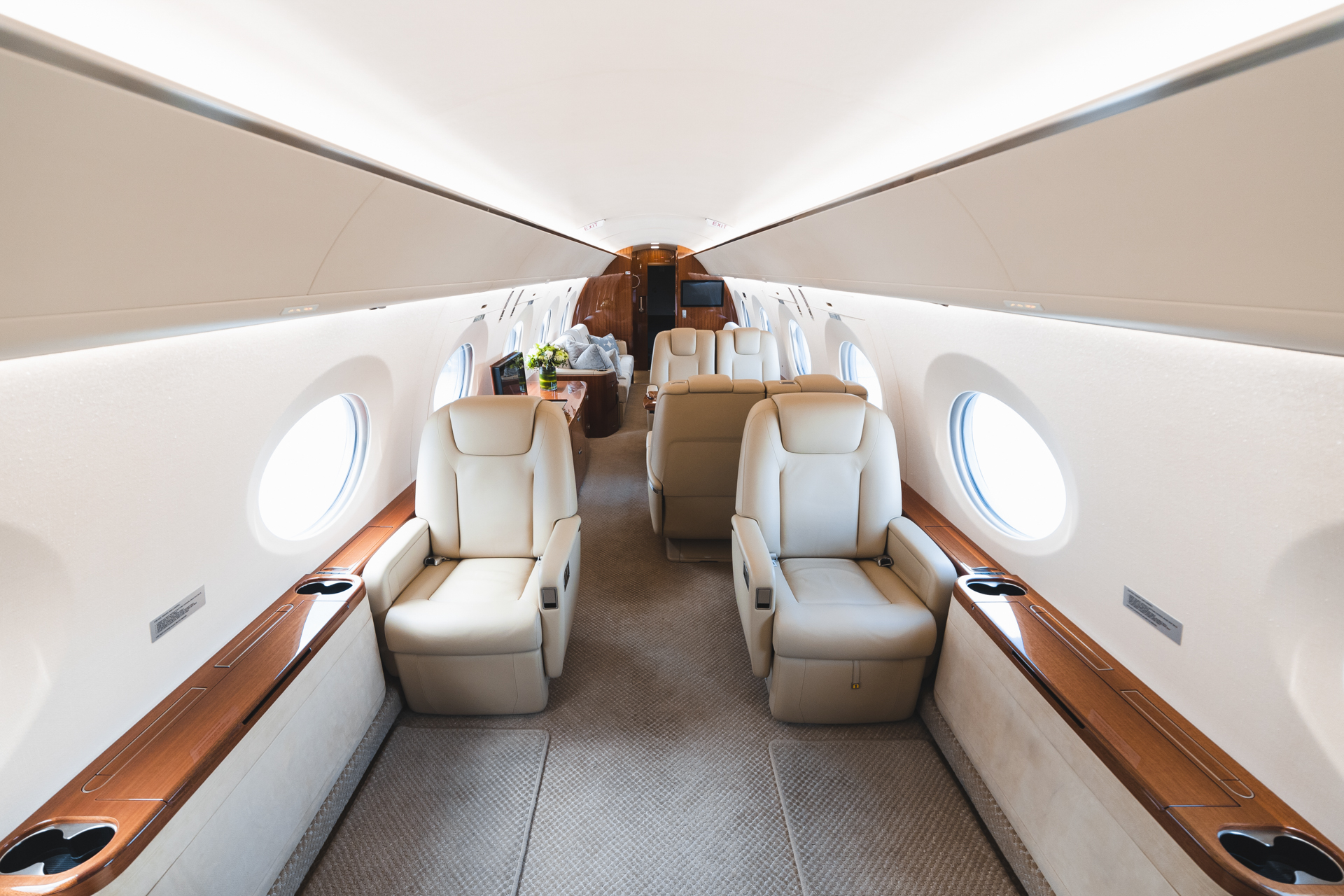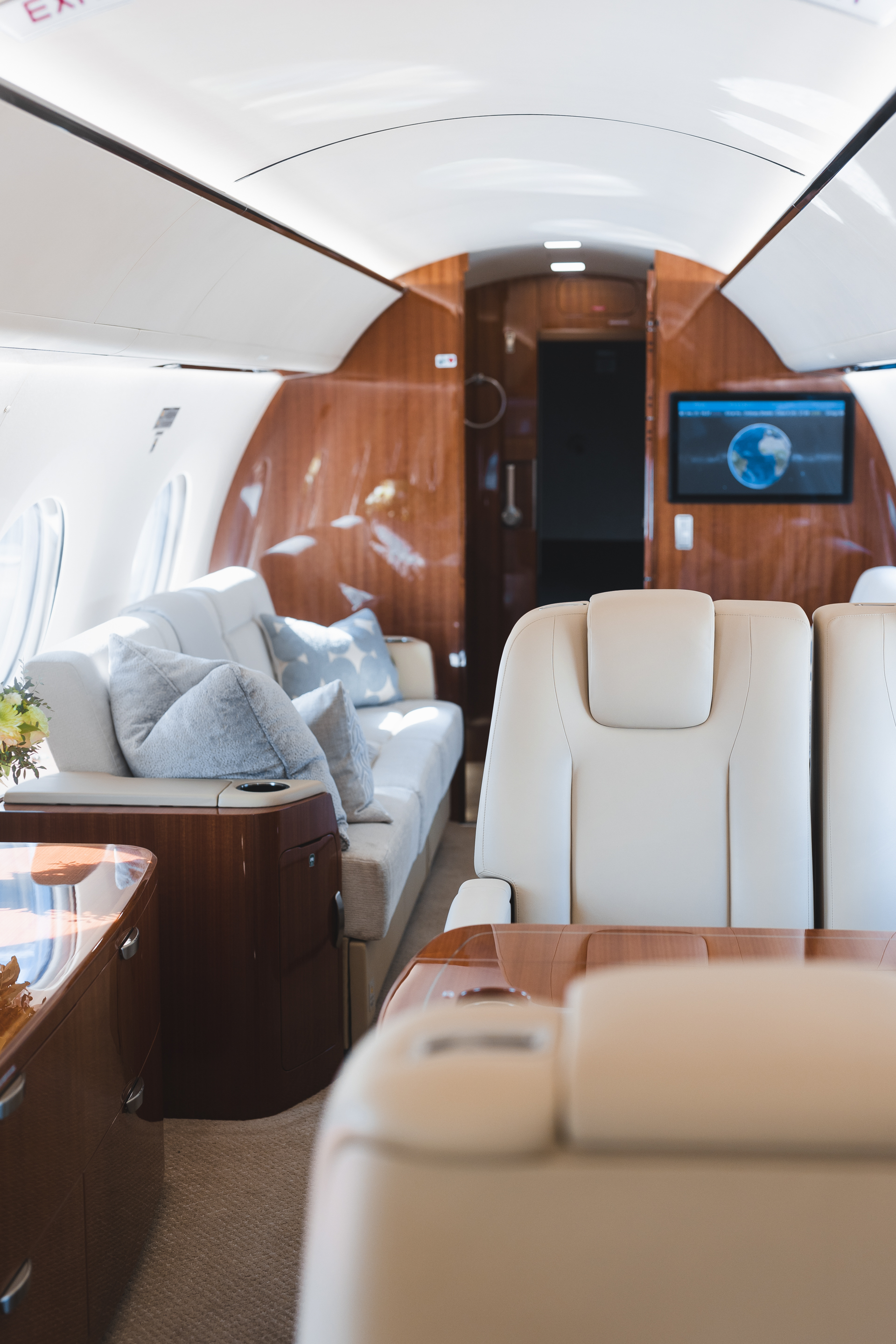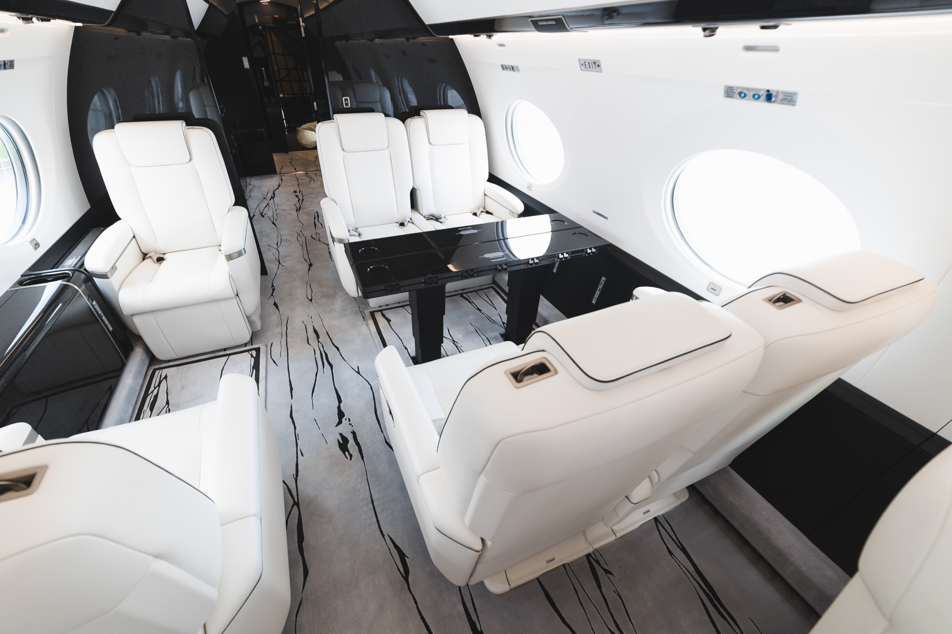 This year, Gulfstream presented a remarkable customer G500, bearing the registration N3030Z. The interior design exudes timeless elegance, showcasing two opulent facing couches at the rear that seamlessly convert into a spacious bed. The seats, enveloped in a radiant beige hue, beautifully juxtapose against the darker, plush carpeting.