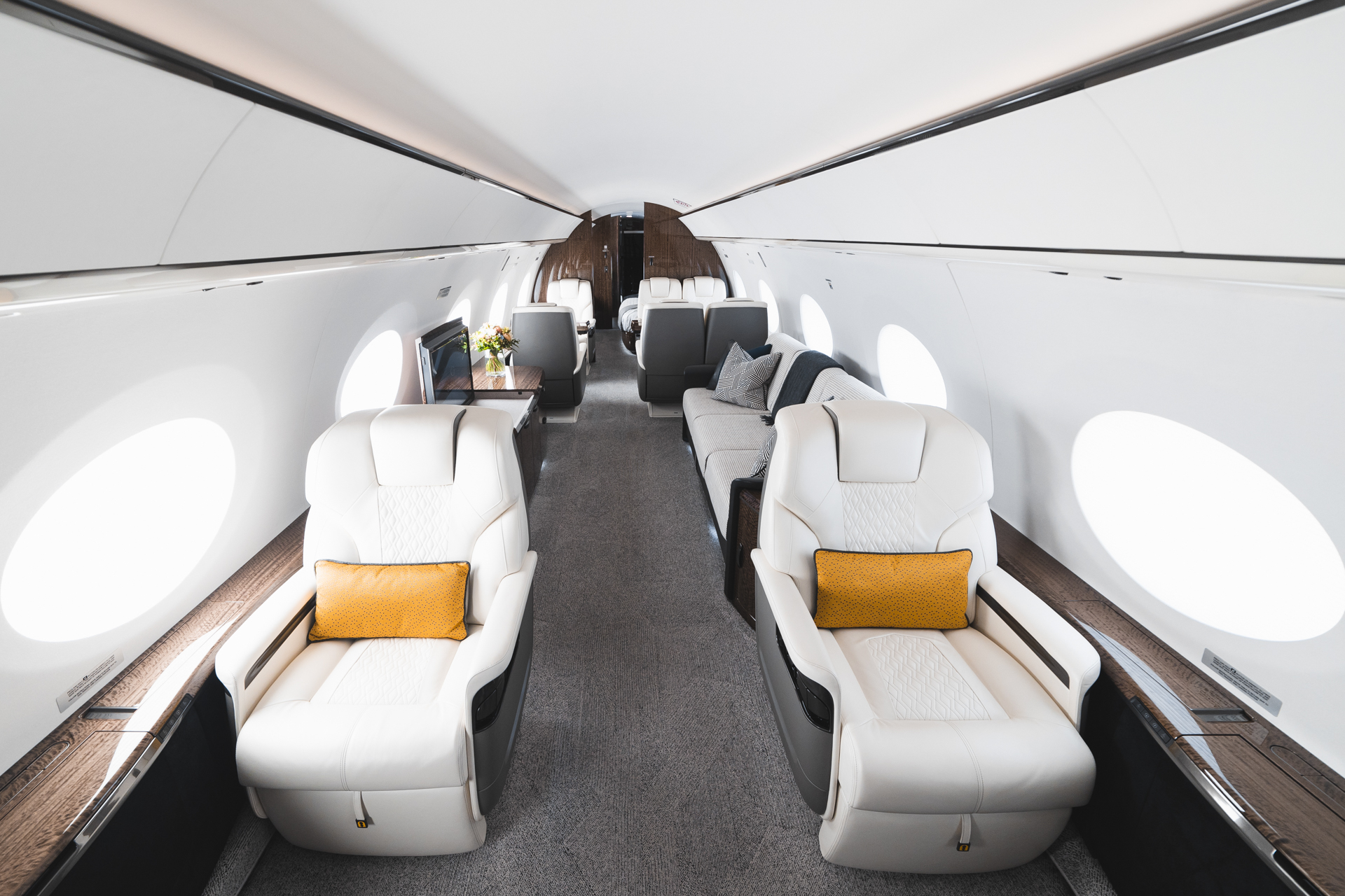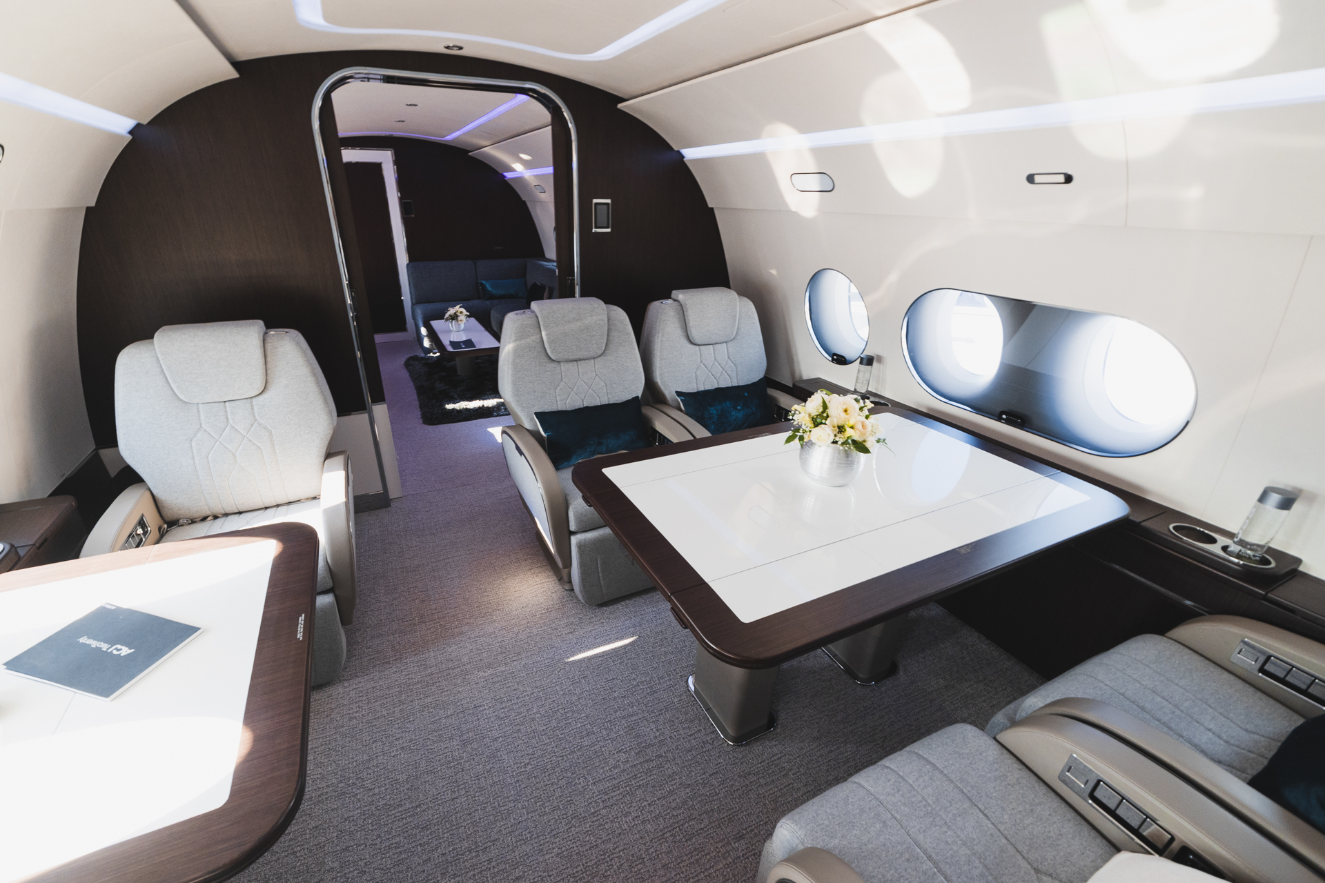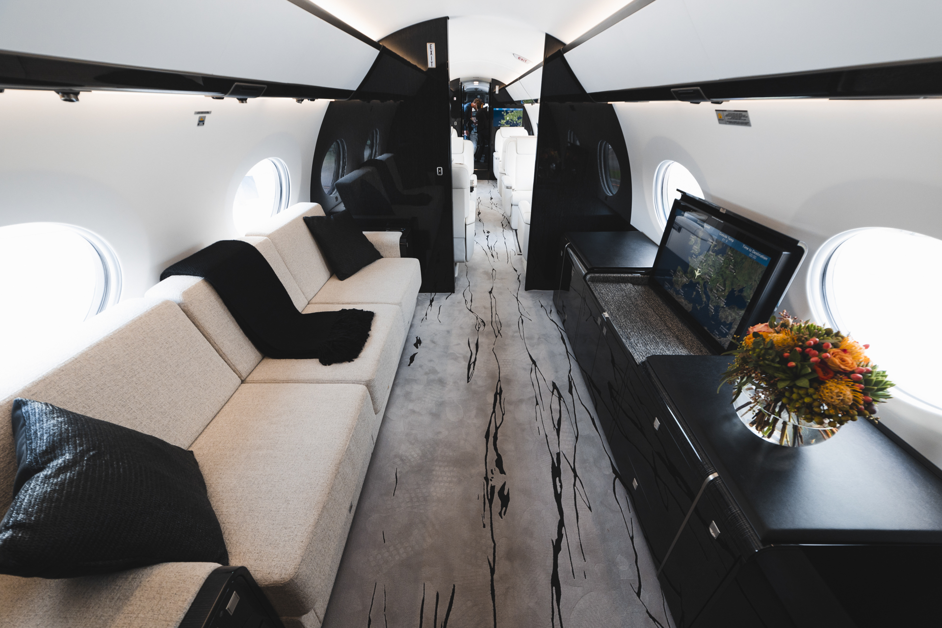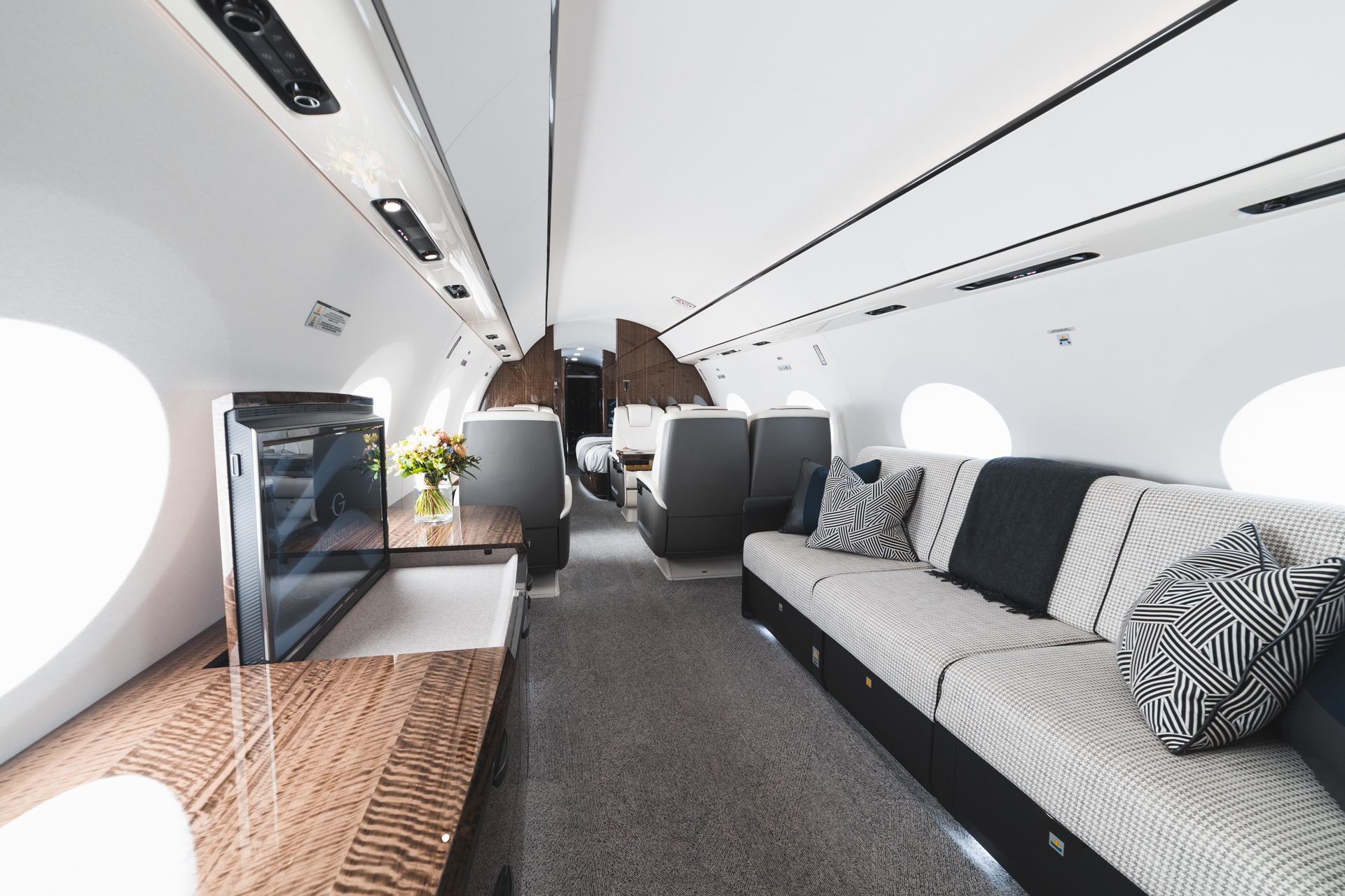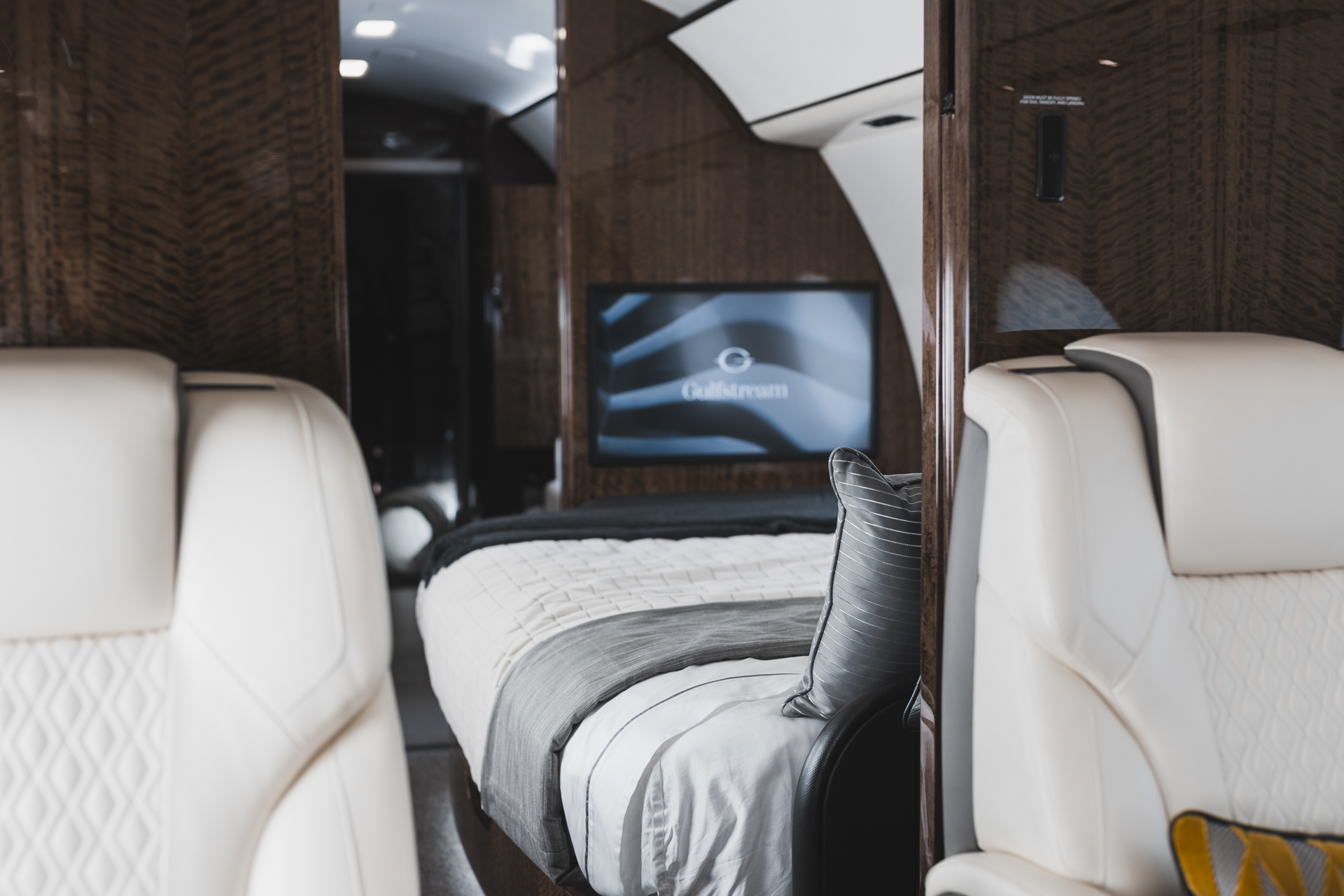 This year, Gulfstream presented a remarkable customer G500, bearing the registration N3030Z. The interior design exudes timeless elegance, showcasing two opulent facing couches at the rear that seamlessly convert into a spacious bed. The seats, enveloped in a radiant beige hue, beautifully juxtapose against the darker, plush carpeting.