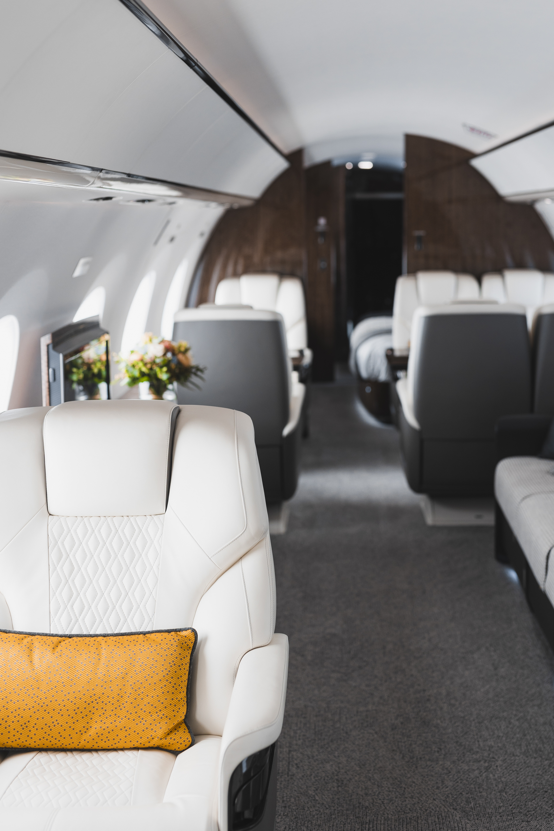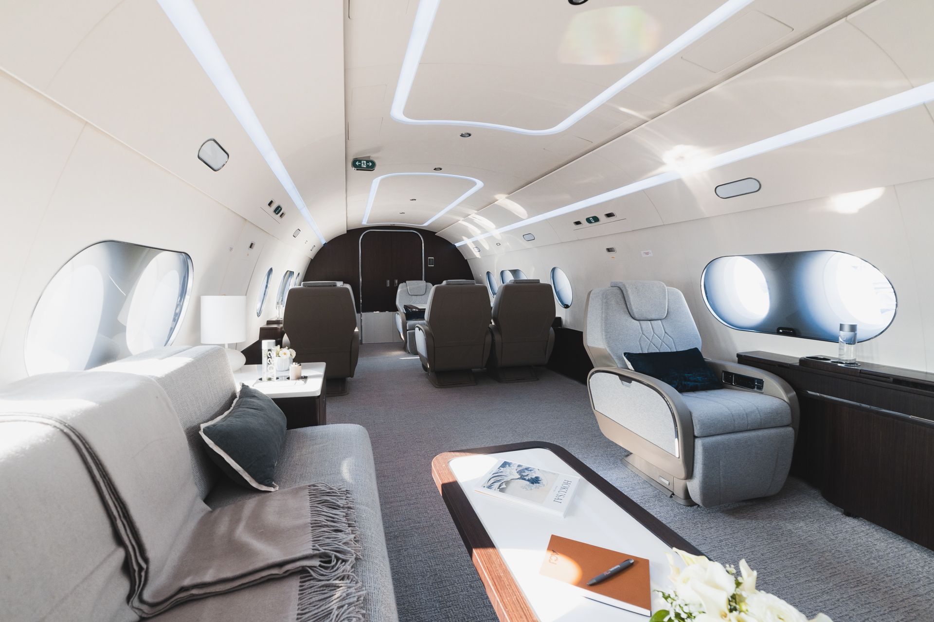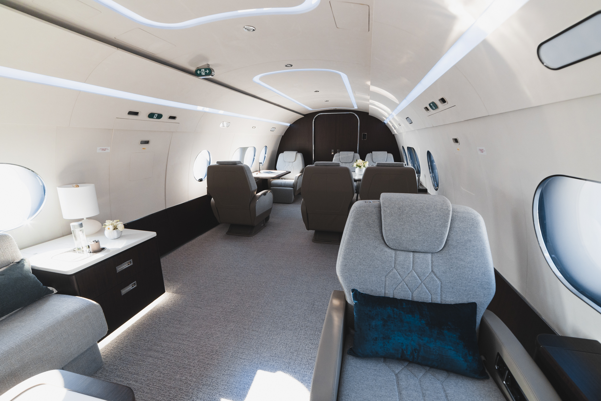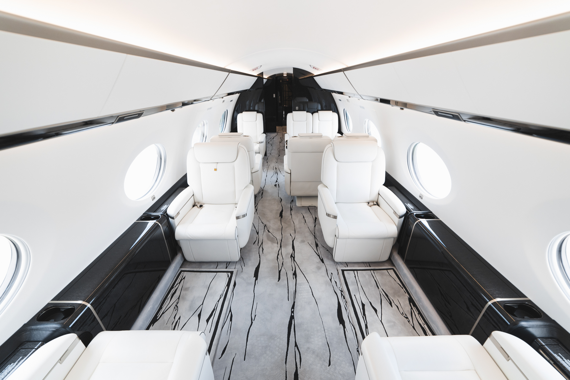 This year, Gulfstream presented a remarkable customer G500, bearing the registration N3030Z. The interior design exudes timeless elegance, showcasing two opulent facing couches at the rear that seamlessly convert into a spacious bed. The seats, enveloped in a radiant beige hue, beautifully juxtapose against the darker, plush carpeting.
