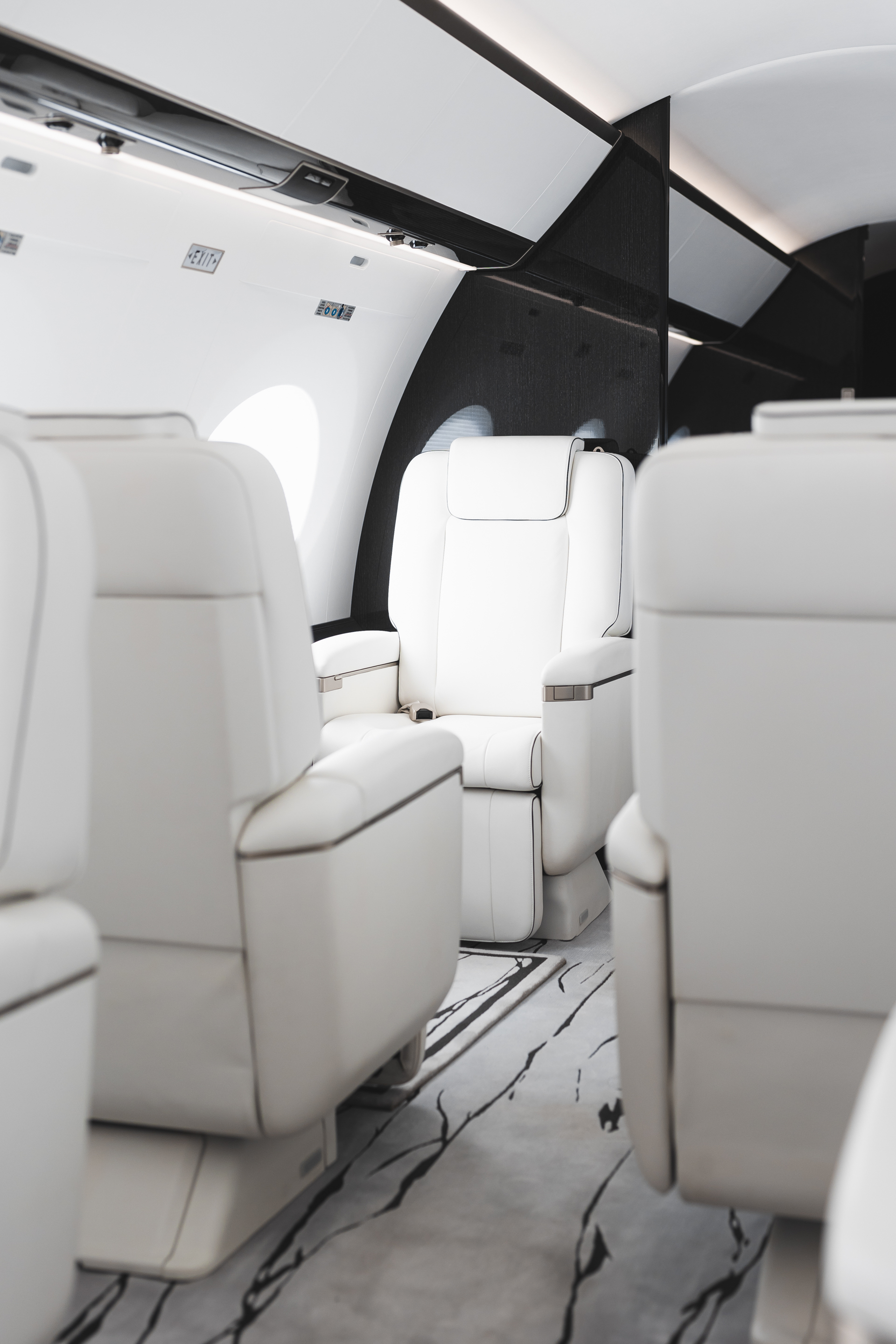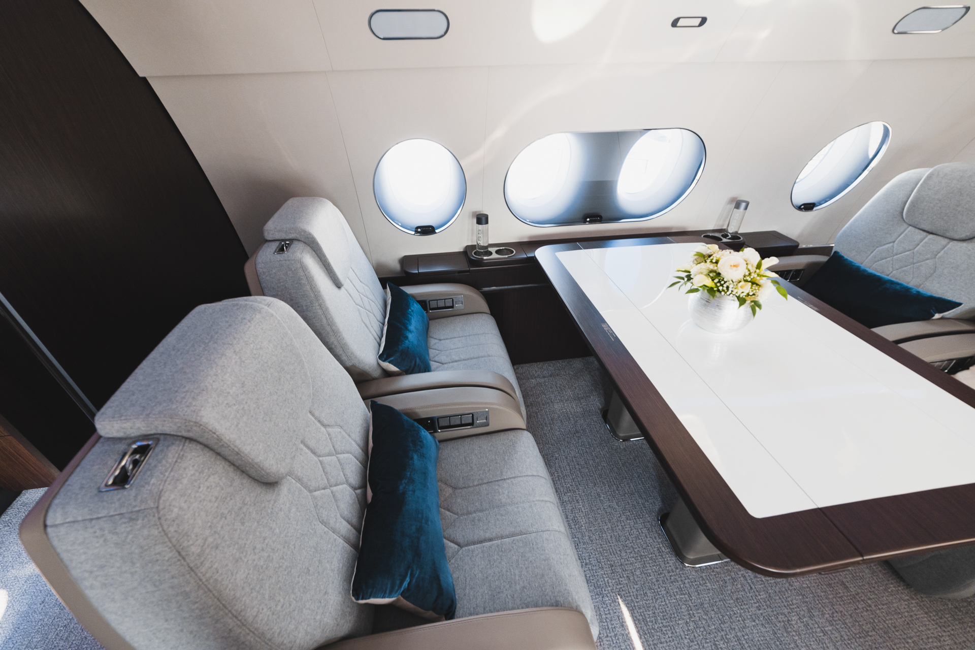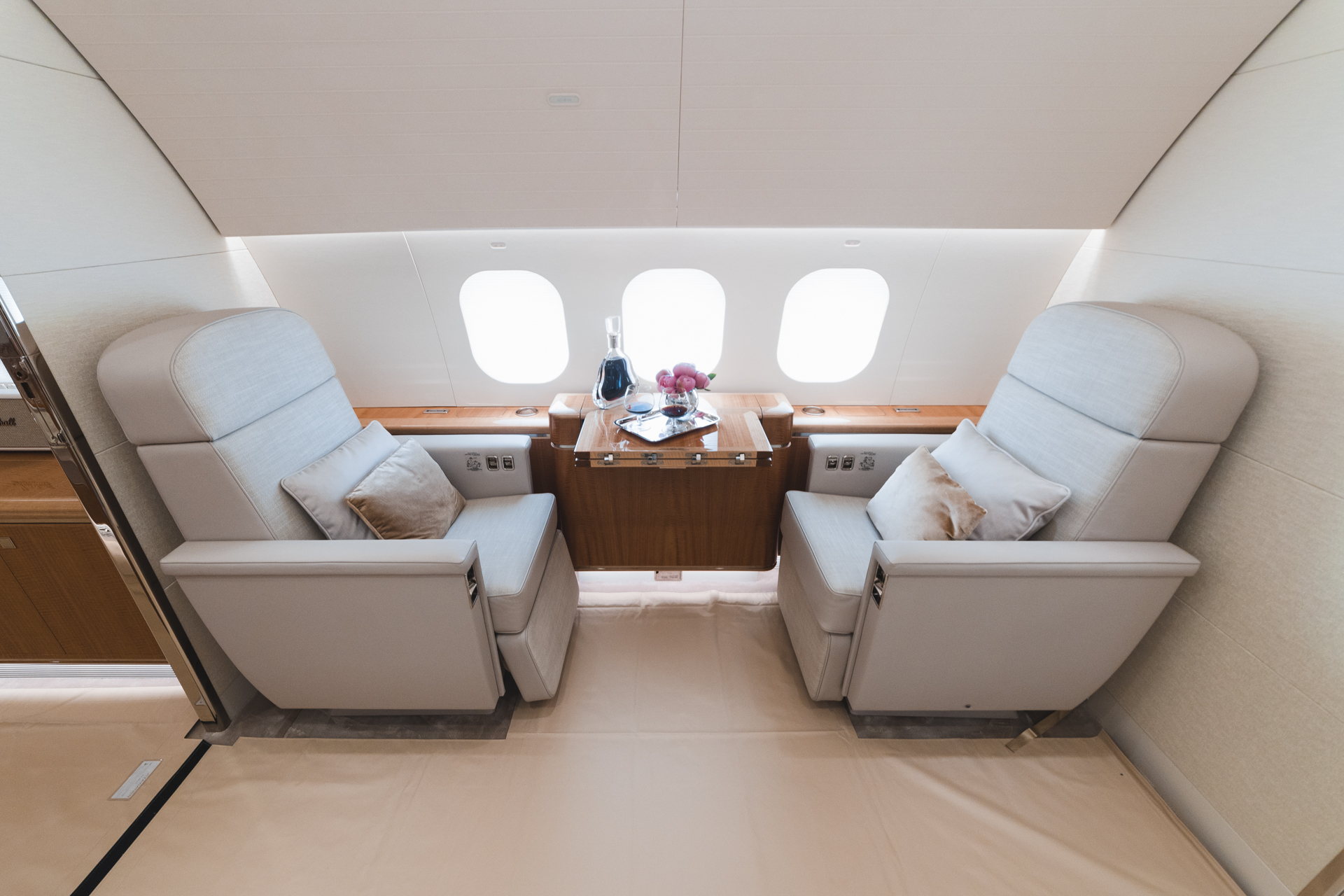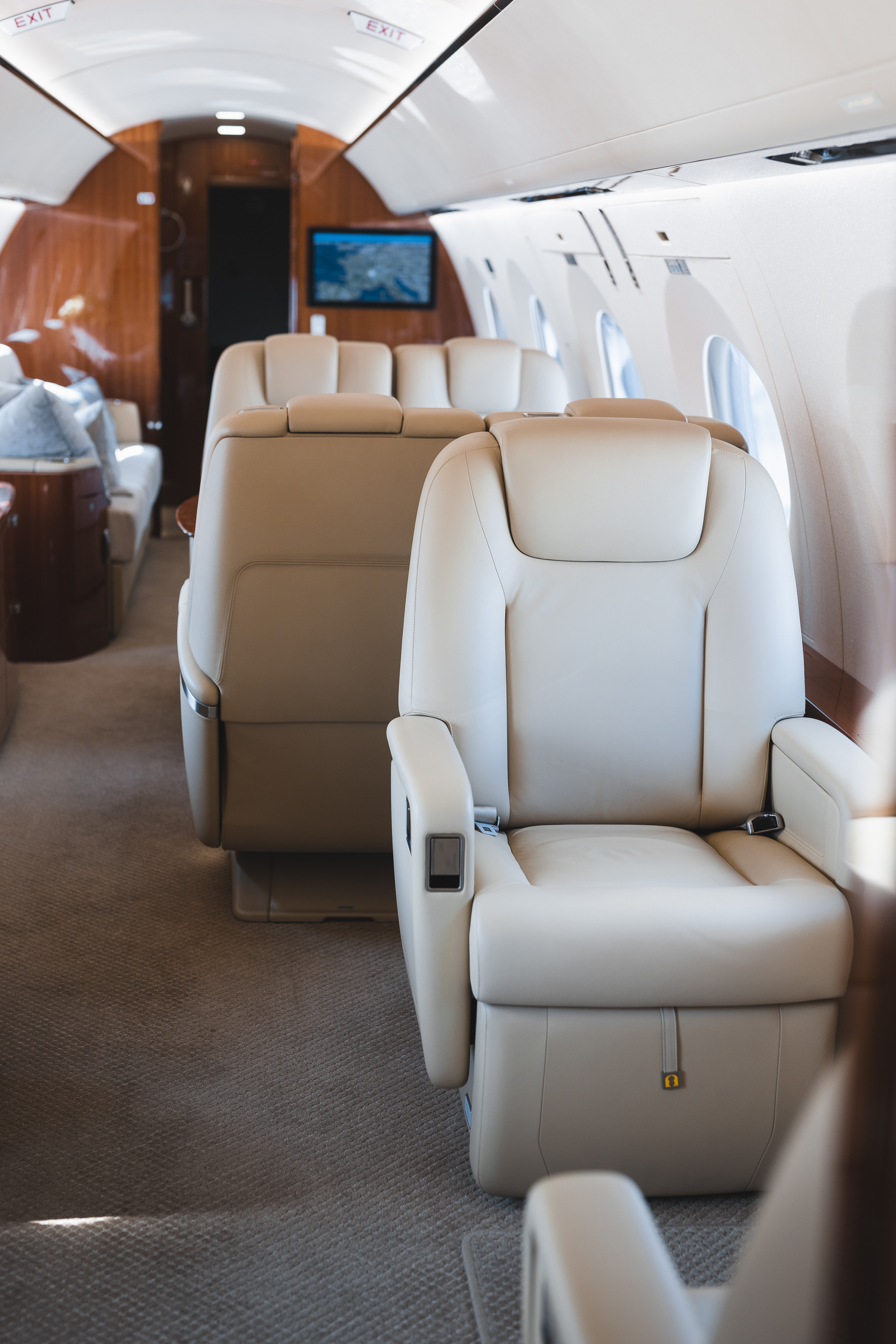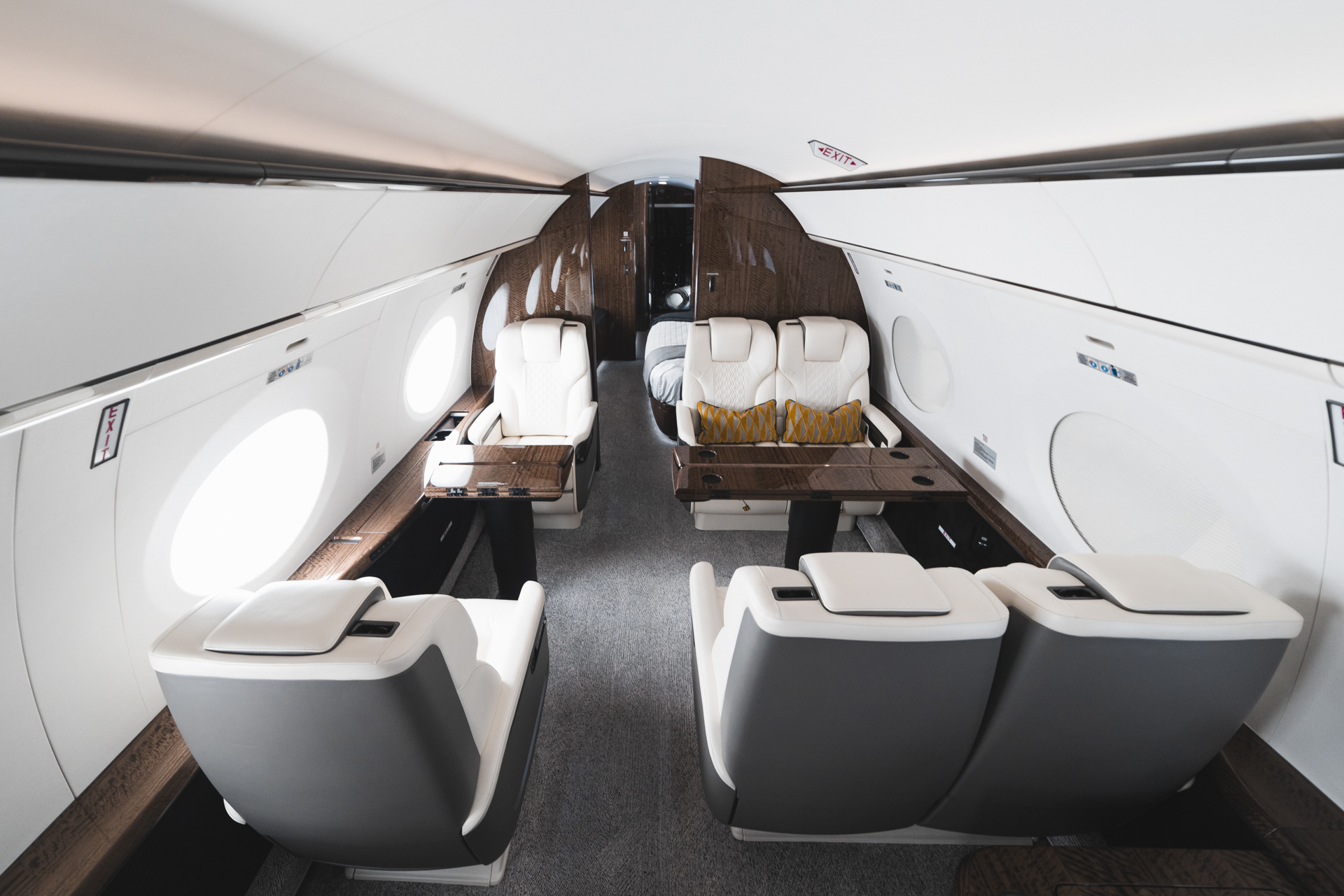 This year, Gulfstream presented a remarkable customer G500, bearing the registration N3030Z. The interior design exudes timeless elegance, showcasing two opulent facing couches at the rear that seamlessly convert into a spacious bed. The seats, enveloped in a radiant beige hue, beautifully juxtapose against the darker, plush carpeting.