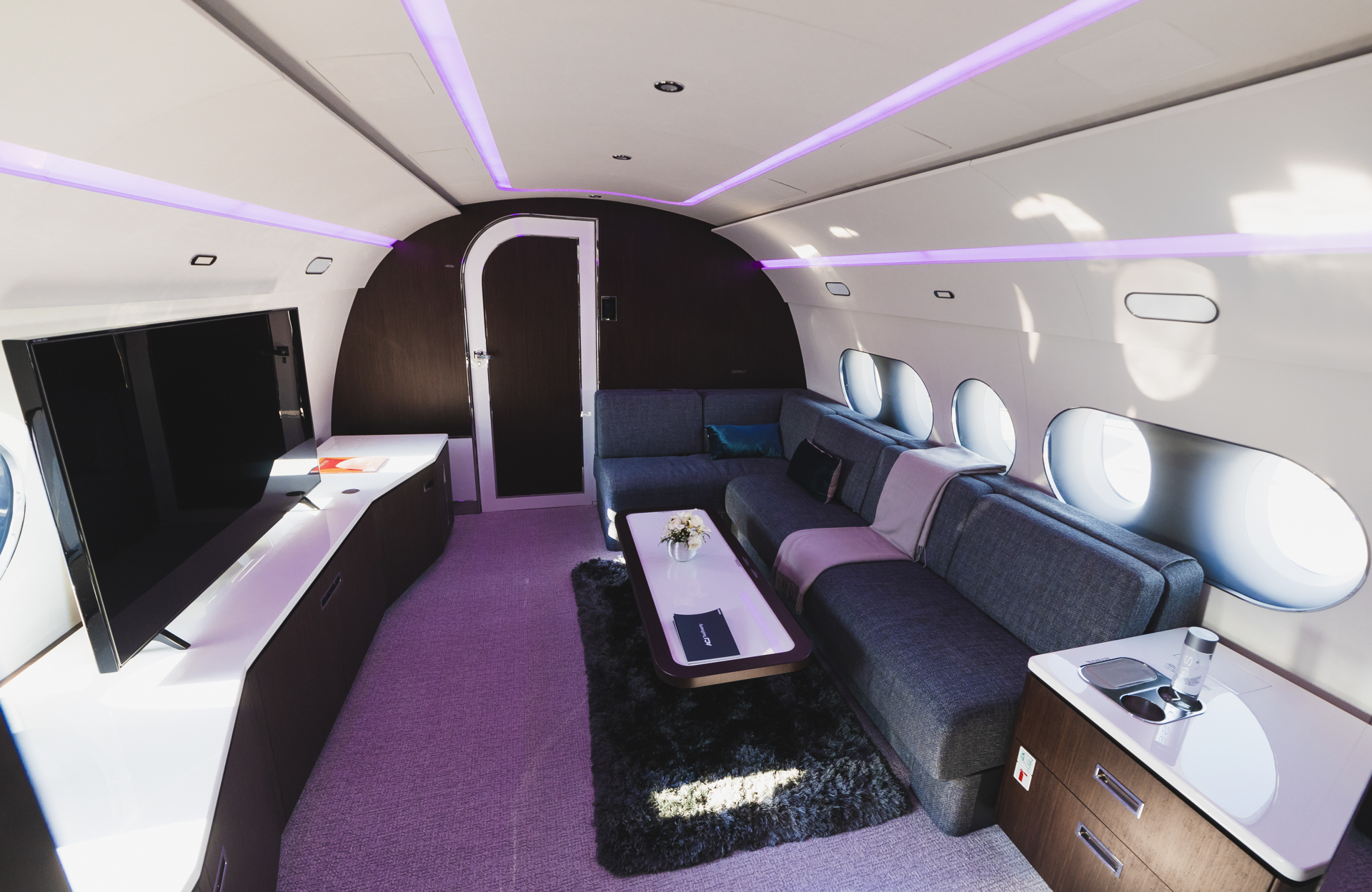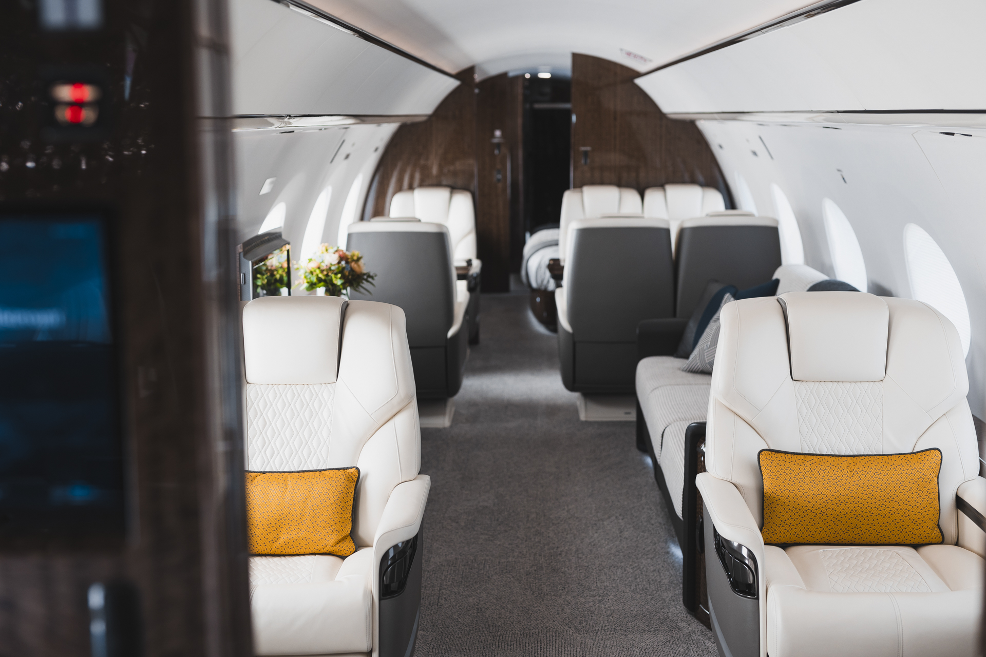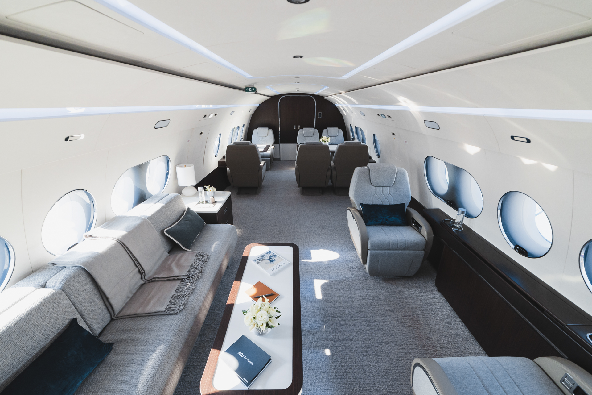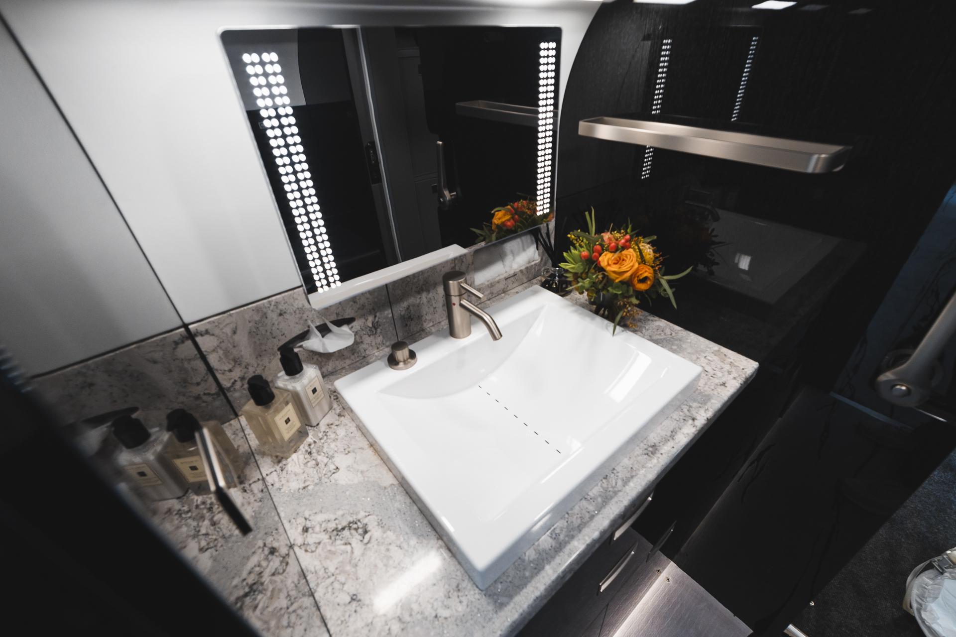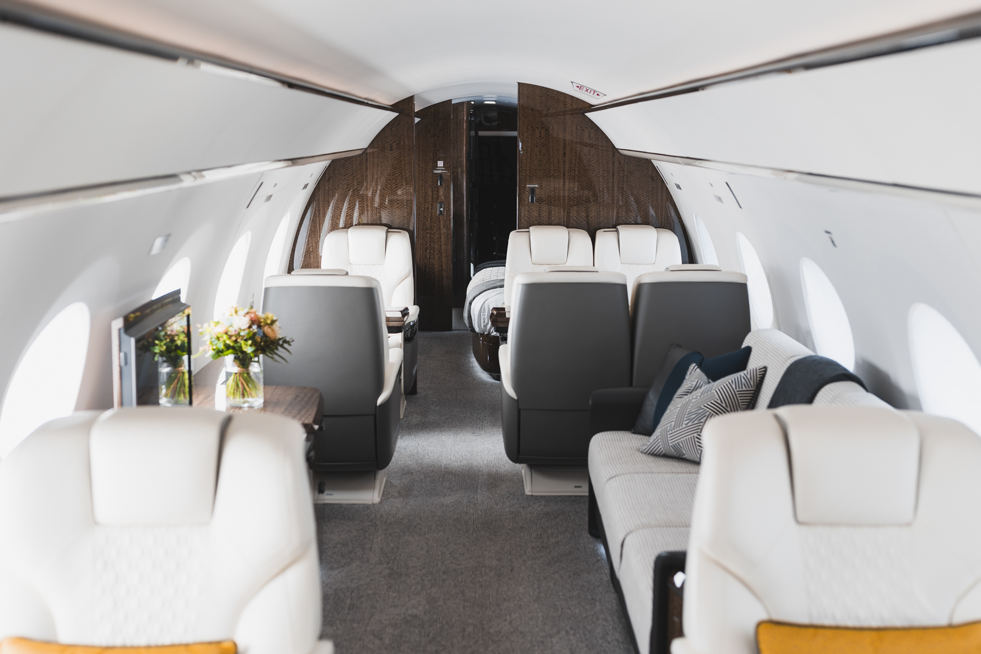 This year, Gulfstream presented a remarkable customer G500, bearing the registration N3030Z. The interior design exudes timeless elegance, showcasing two opulent facing couches at the rear that seamlessly convert into a spacious bed. The seats, enveloped in a radiant beige hue, beautifully juxtapose against the darker, plush carpeting.