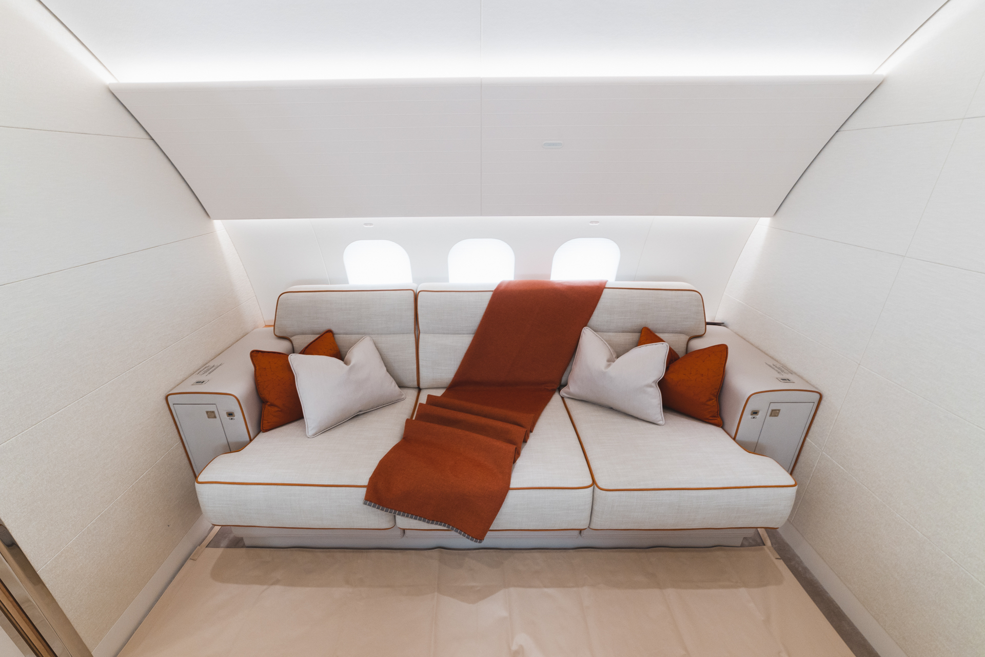 Upon entering the aircraft, a gracefully appointed floor guides you towards the initial section of the VIP cabin. The first door on the left leads to a petite suite, featuring a luxurious lie-flat first-class seat intended primarily for crew rest. Just beyond, one encounters the expansive galley, where delectable, freshly prepared meals can be savored. Opposite the galley lies one of three lavatories, primarily designated for the entourage, much like the eight seats in the first section. These seats, adorned in exquisite Hermes fabric, provide the ultimate comfort of lie-flat recliners.