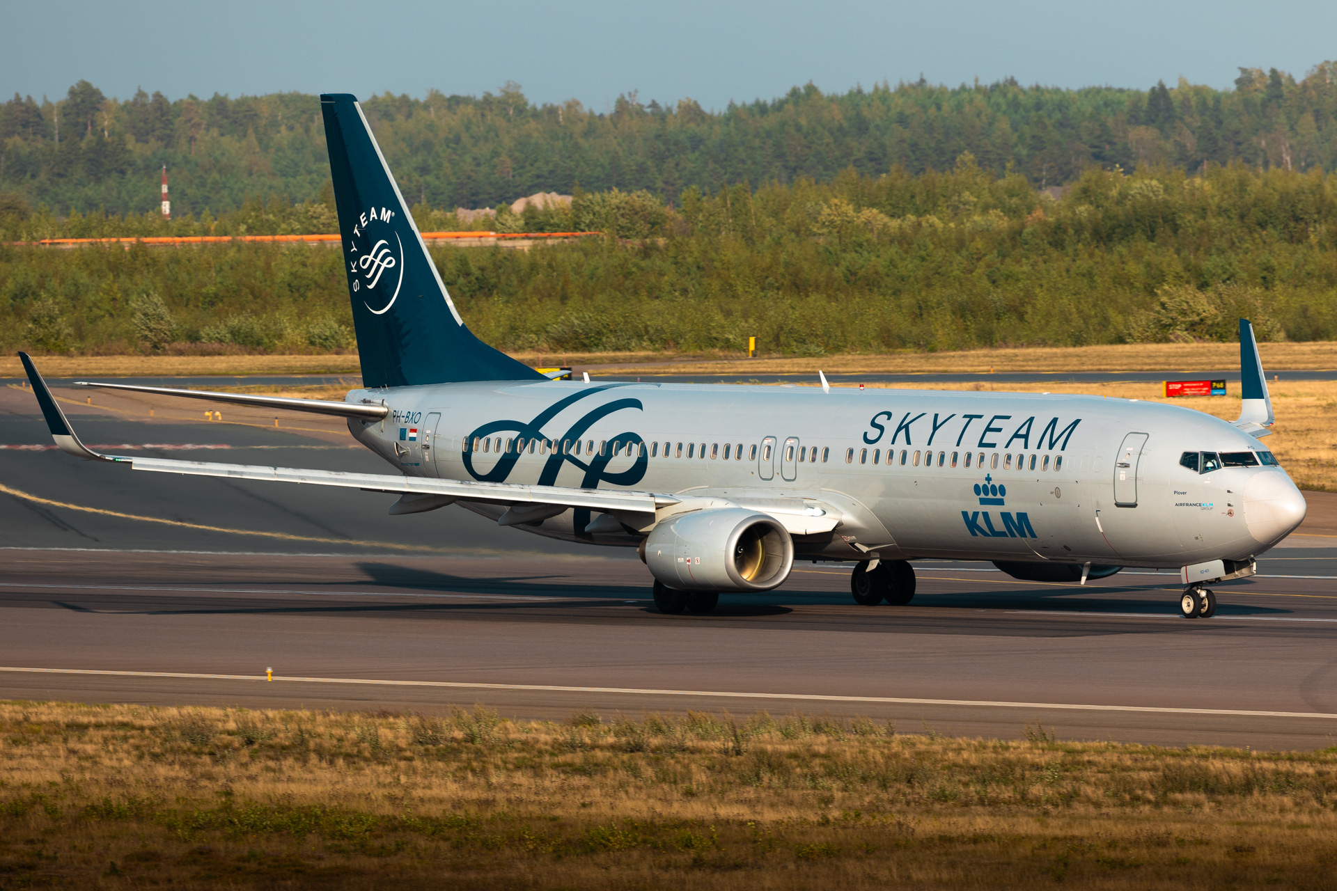 A KLM Boeing 737-900 wearing the Skyteam livery departing runway 22R