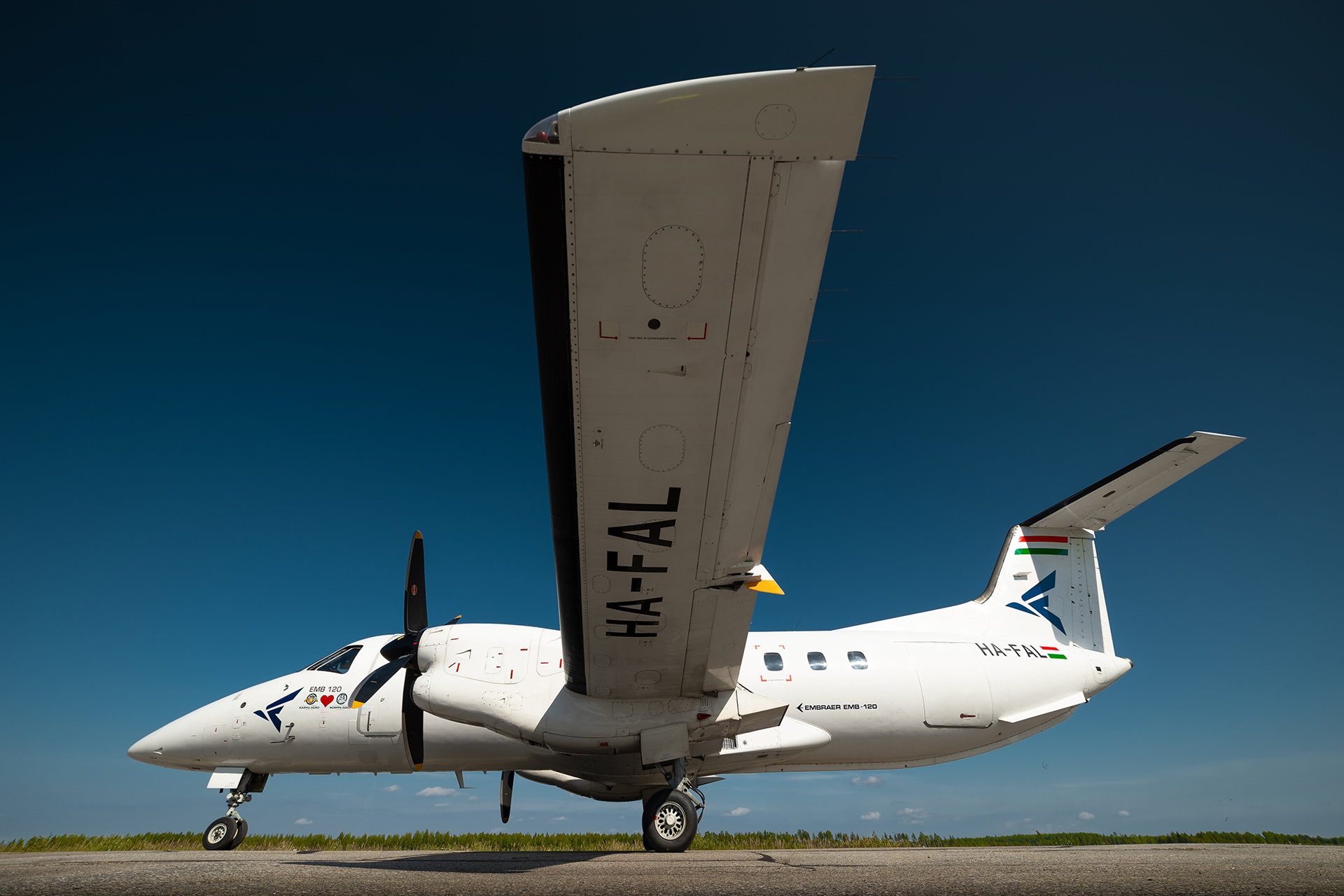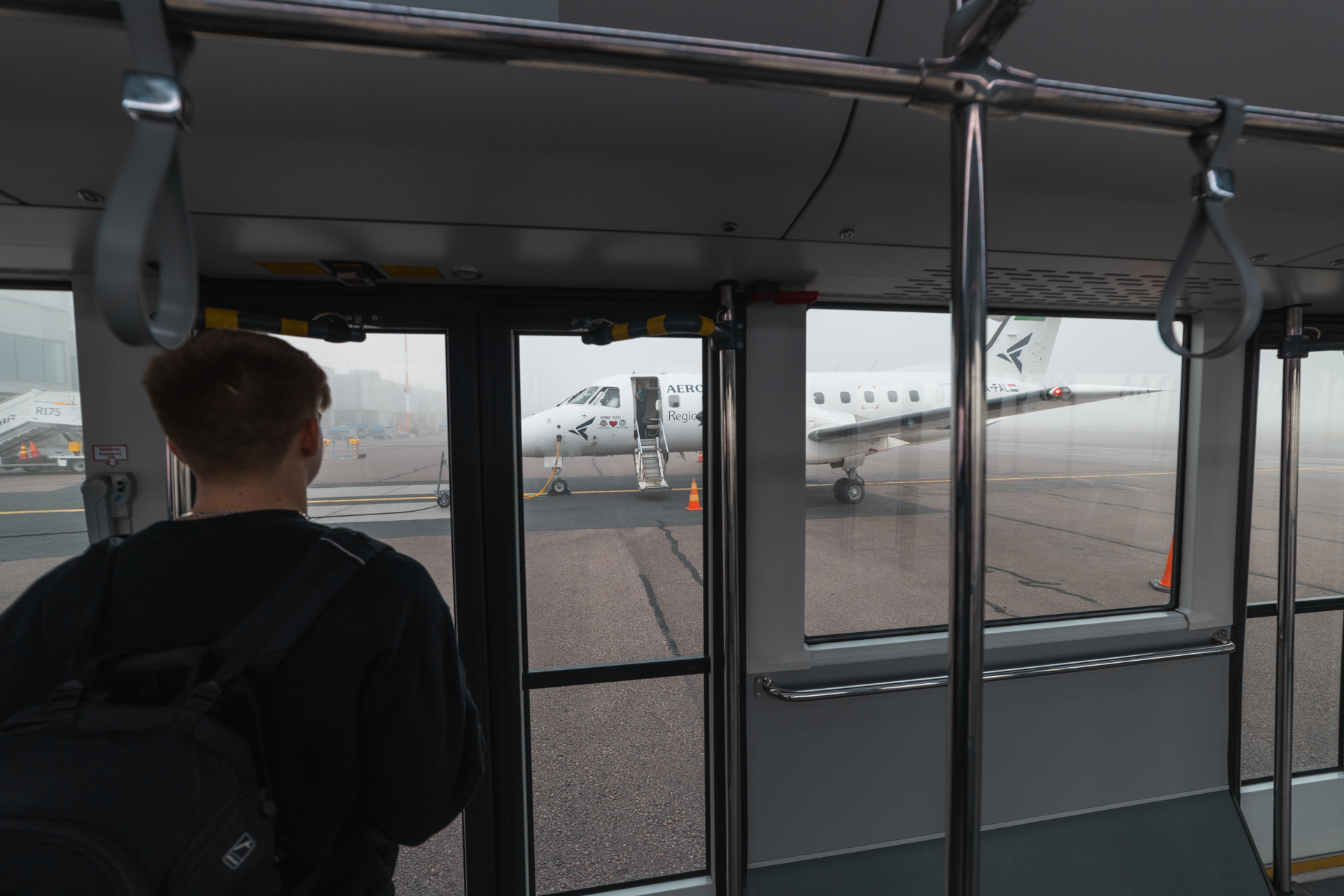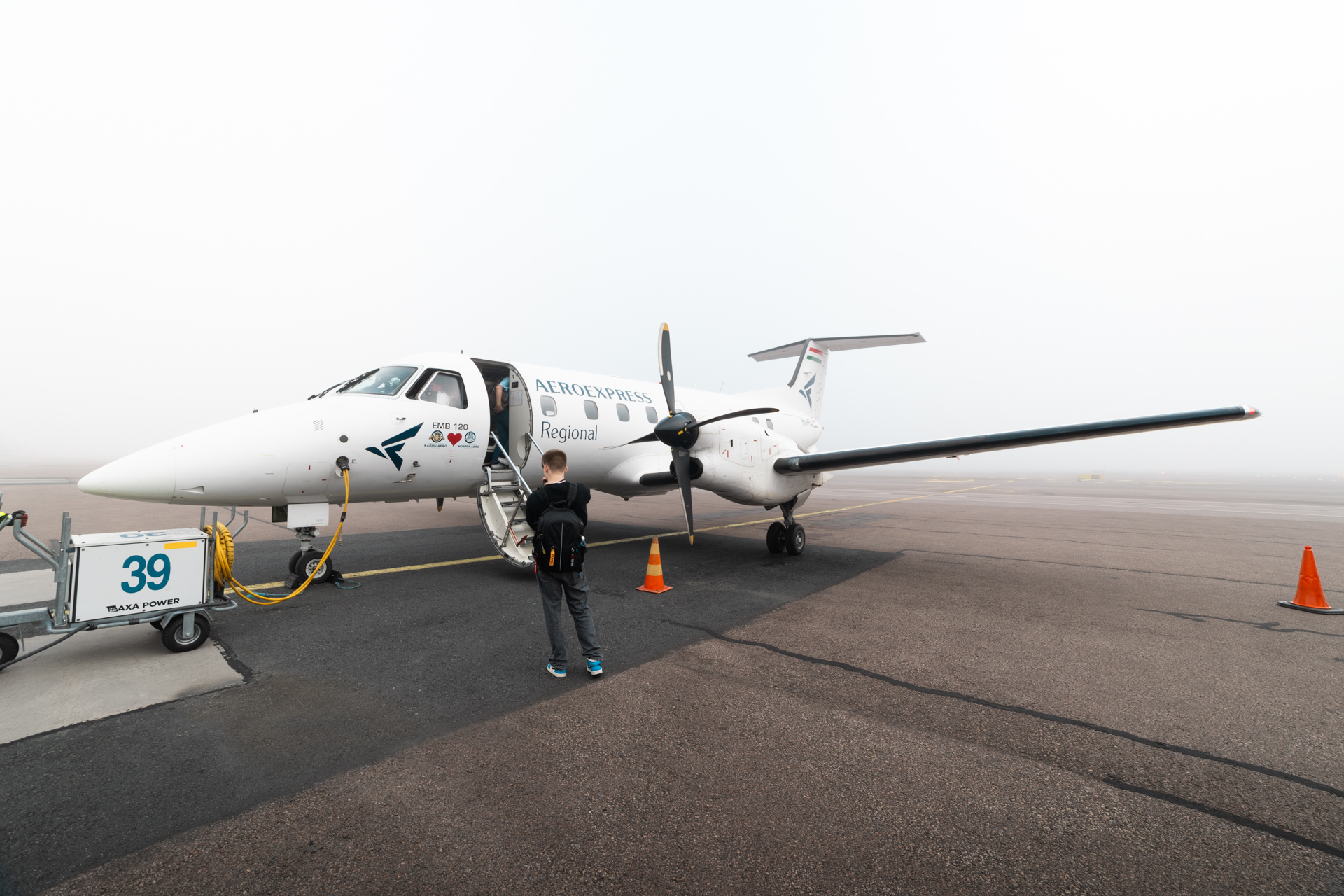 At some point our Embraer EMB-120 appeared in the thick fog. We exited the bus and walked over to HA-FAL, a 34.6 year old Embraer EMB-120. Of course I had to snap some photos during boarding. We were greeted by a very friendly flight attendant, who we'd later have very nice chats with.