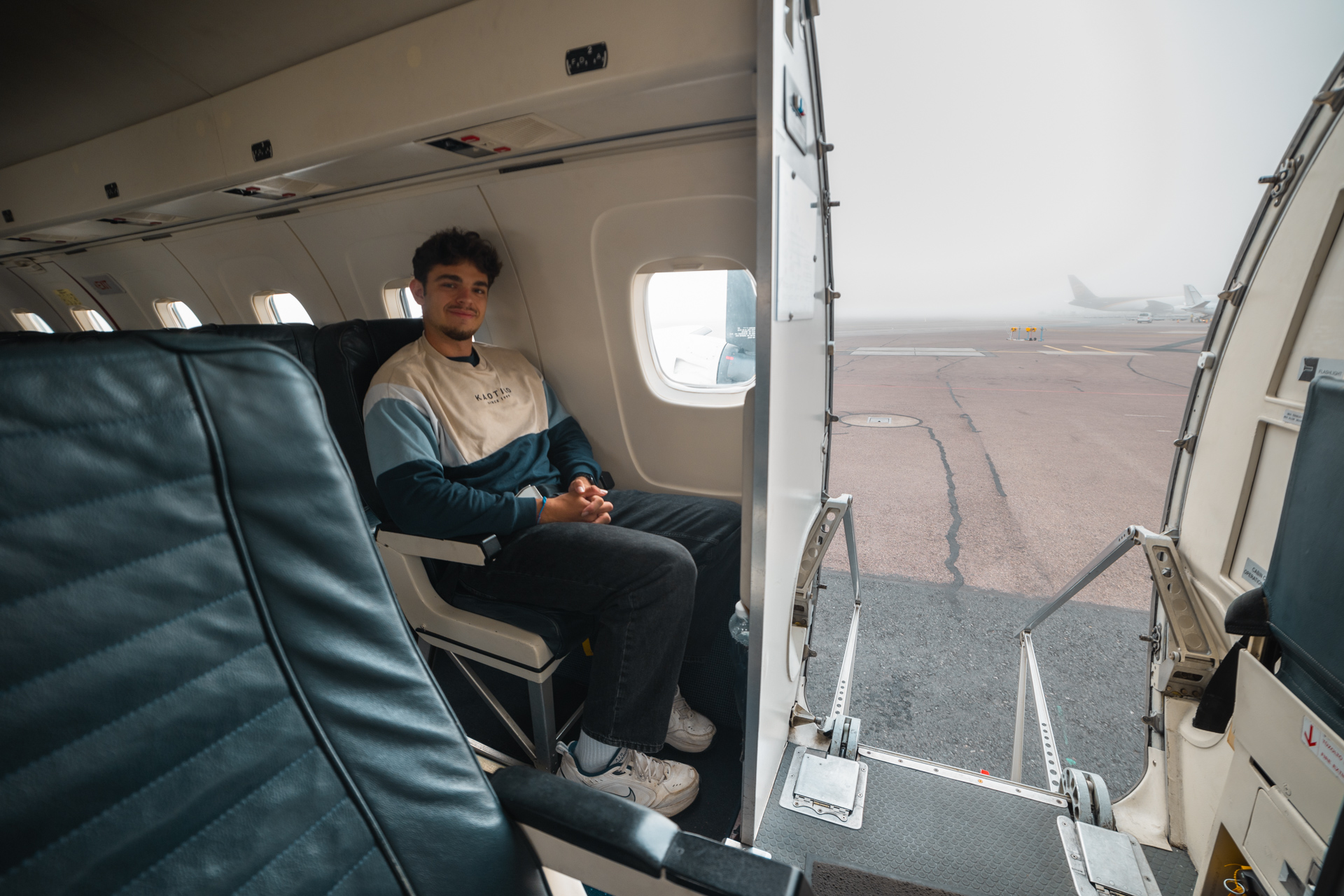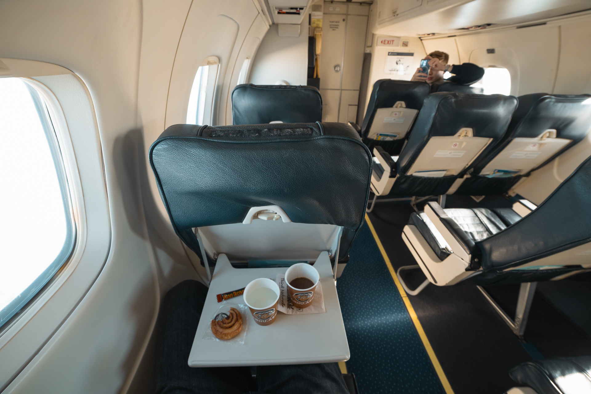 As you might see in this photo the legroom on the EMB-120 is absolutely terrible if you are not a very short individual. Since comfort definitely was not important on this trip but rather the experience of flying a rare turboprop, the lack of legroom did not negatively influence the mood at all. Even much tinier than the legroom was the restroom that I unfortunately had to visit after drinking my coffee. It is close to impossible to get in there. The only upside was that if some turbulence had hit during my restroom visit, I could not have flown around, since I was touching every wall to every side.