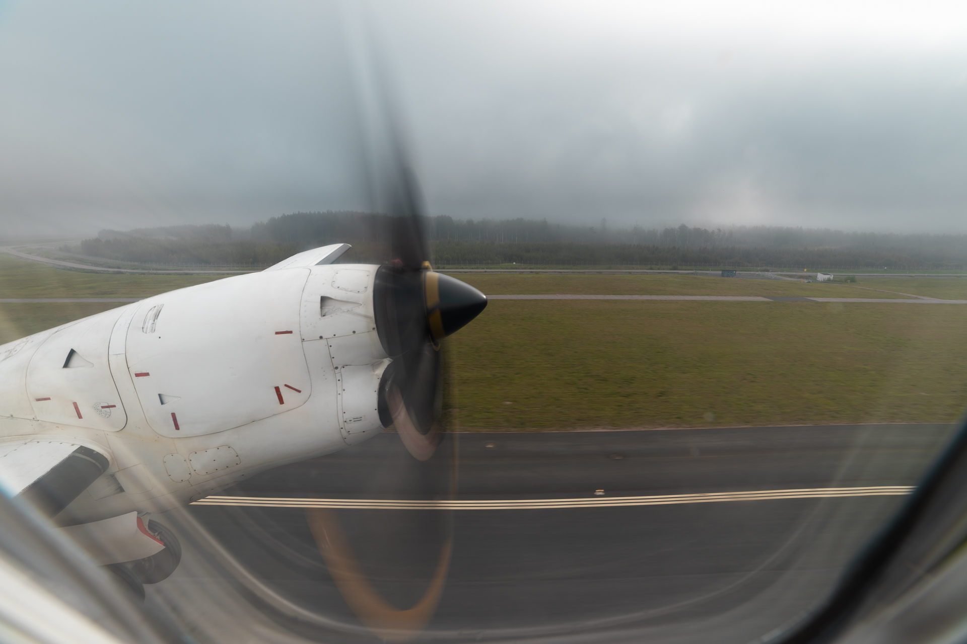 Soon after the door was closed and the pilots started the two PW100 turboprop engines. This would not only be the first EMB-120 flight of my life but also the first time flying on any turboprop aircraft. After engine start we started taxiing towards runway 15 as the fog started to clear up. There was no long queue for takeoff so not long after reaching the beginning of runway 15 we lined up and the pilots set takeoff thrust. The EMB-120 is quite a rocket. Even though we were probably nowhere near full thrust we got pushed back into our seats quite forcefully and very soon the gears lifted from the ground and we were airborne. The noise on takeoff was absolutely deafening, but very enjoyable for us avgeeks!