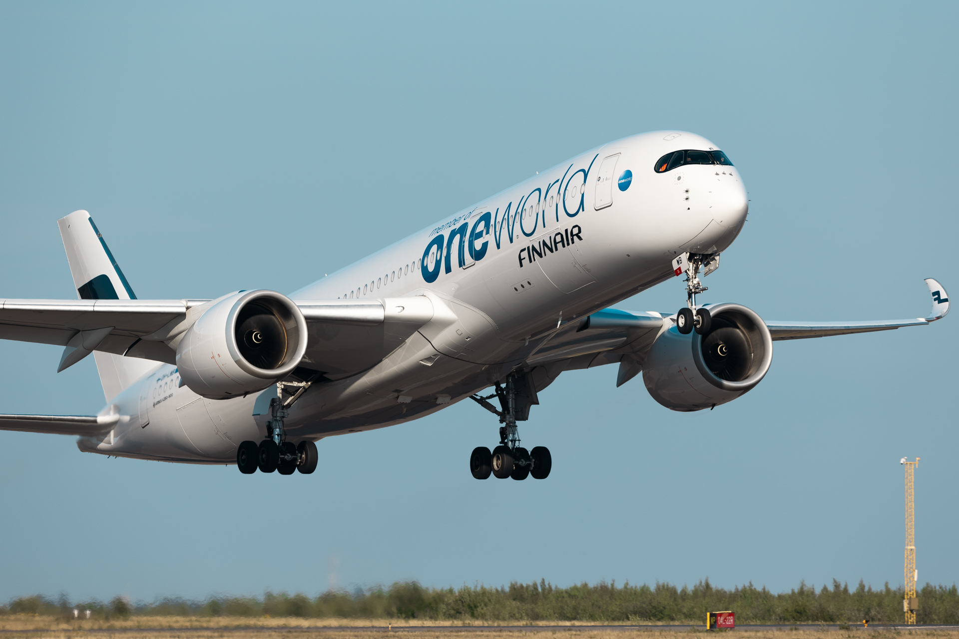 A Finnair Airbus A350 wearing the Oneoworld livery departing runway 22R