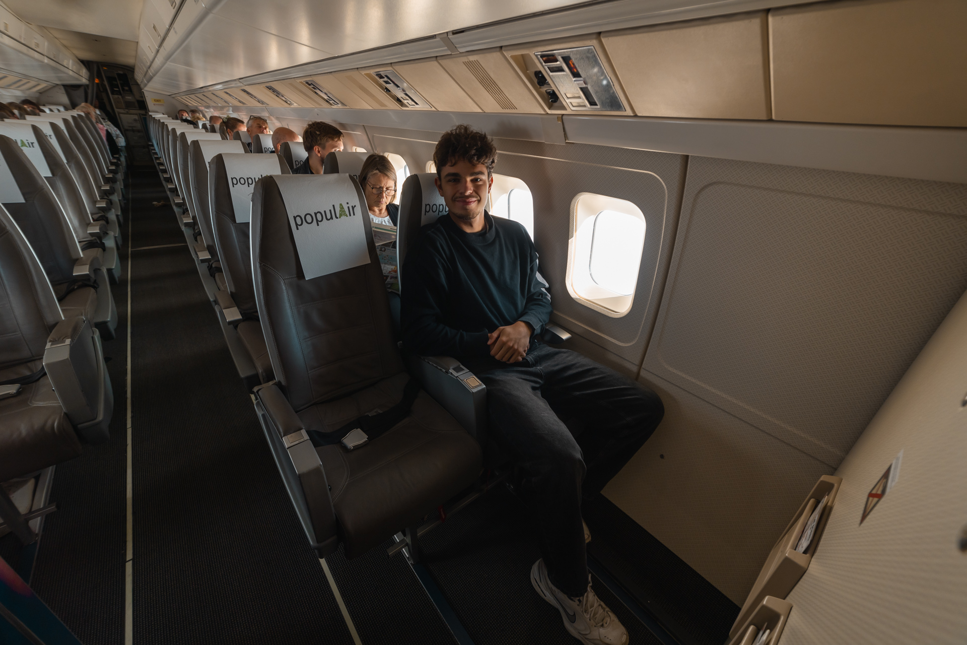 For the flight back I chose to sit on the other side, right next to the front door in row 1. Boarding was soon completed, door closed and engines running. We taxied past Adam who was recording our departure. Meanwhile the wind direction had changed so we took off from runway 12. Once again the takeoff was super noisy but very quick and powerful.