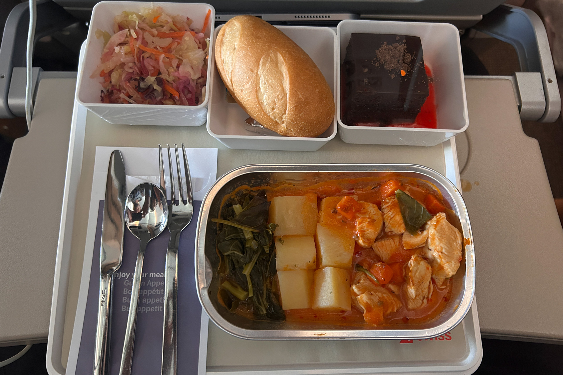 There was a choice between a chicken dish with potatoes and a vegetarian lasagna. I went for chicken, which was alright. The potatoes lacked flavour and the greens were definitely not very tasty (and I‘m definitely not a picky eater). The salad was really tasty as well as the cake. Overall the dining experience was okay. I‘m definitely a harsh critique, but Swiss does brand themselves as kind of a premium airline. Once again, I loved the metal cutlery, just like on the Lufthansa flight three weeks ago.