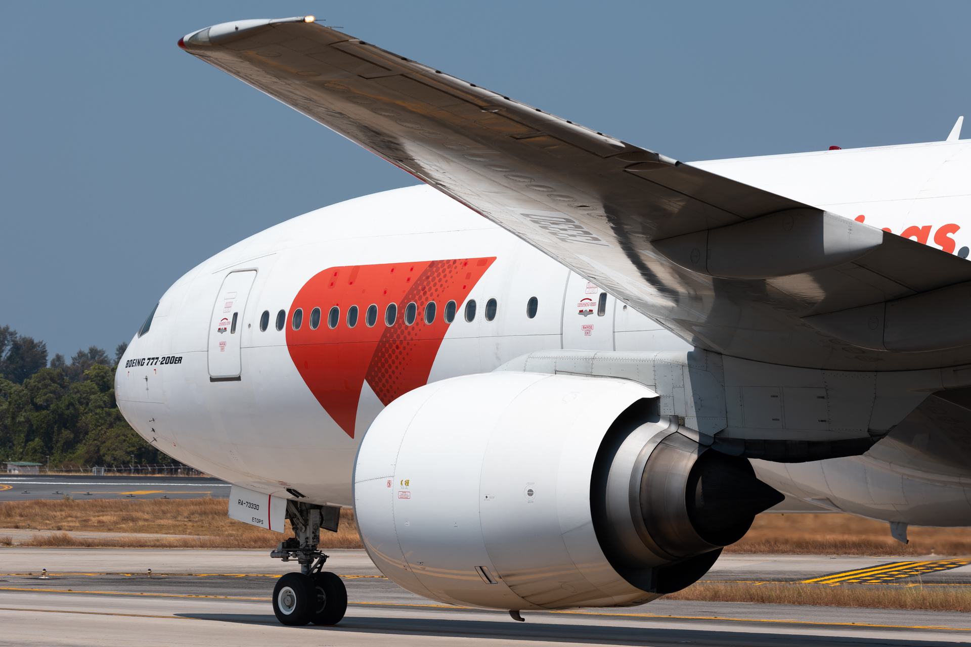 A Thai Airways Boeing 777-2D7(ER), registered as HS-TJS taxiing to the active runway