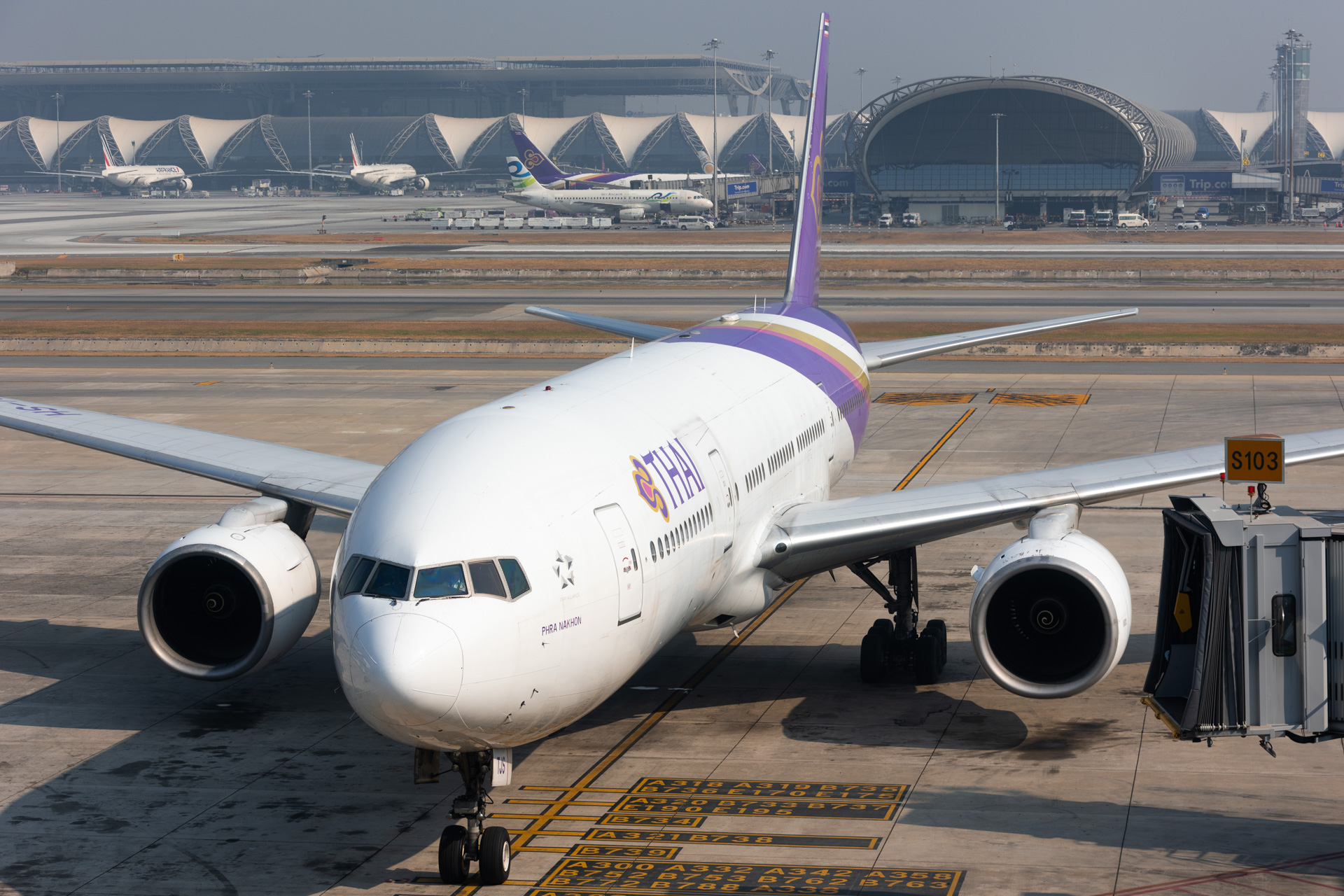 A Thai Airways Boeing 777-2D7(ER), registered as HS-TJT resting at the gate