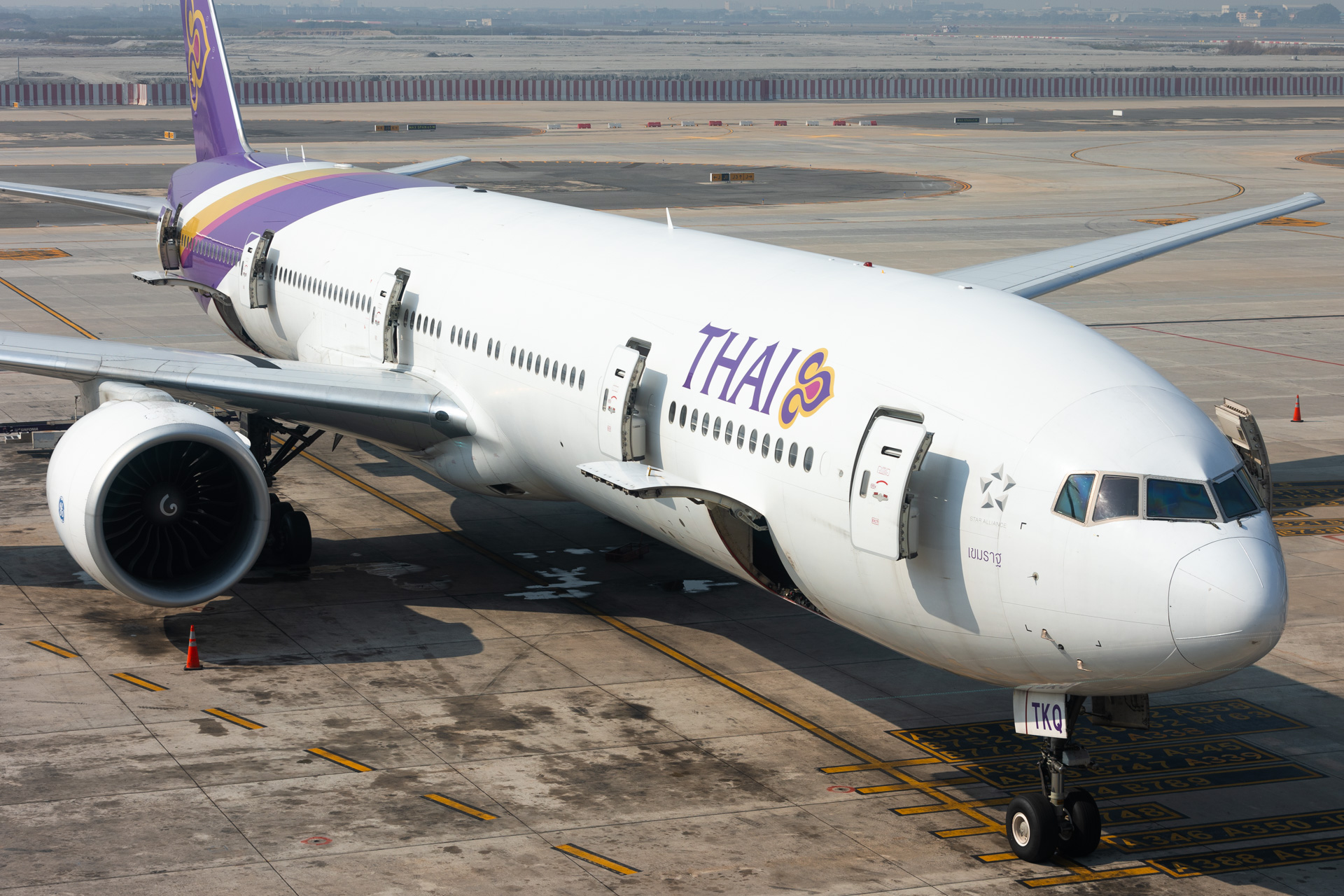 A Thai Airways Boeing 777-3AL(ER), registered as HS-TKQ resting at the gate with all doors open