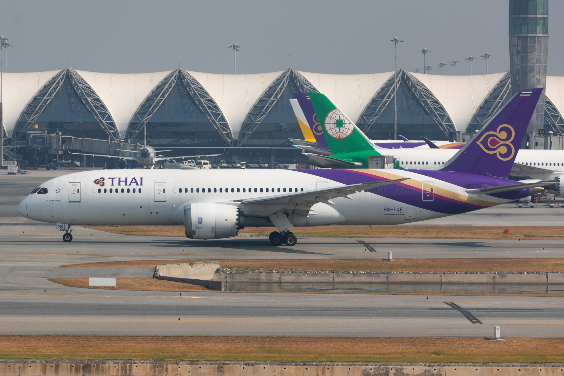 A Thai Airways Boeing 787-8, registered as HS-TQE taxiing to the active runway
