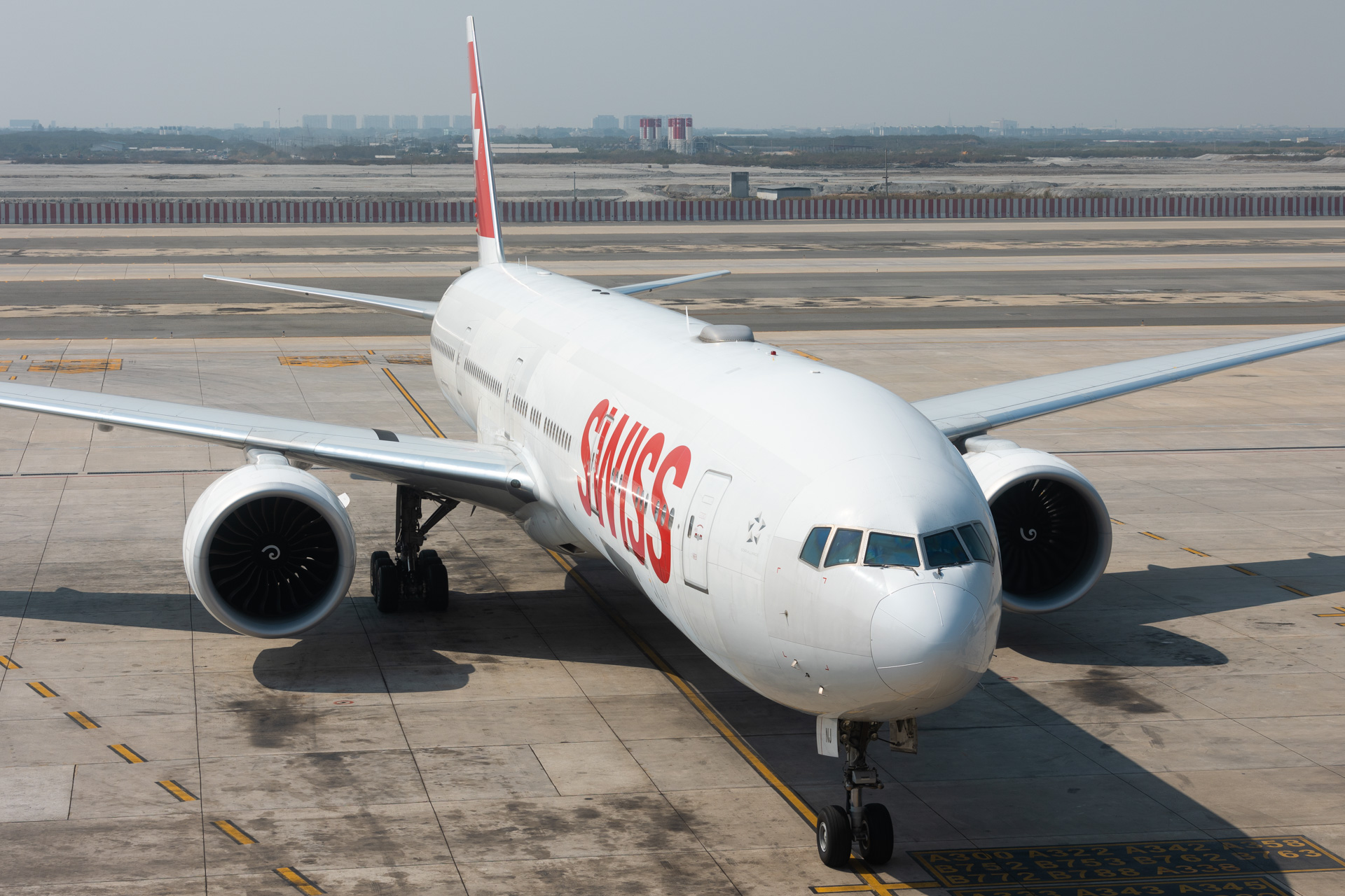 A Swiss Boeing 777-3DE(ER), registered as HB-JNJ taxiing to the gate