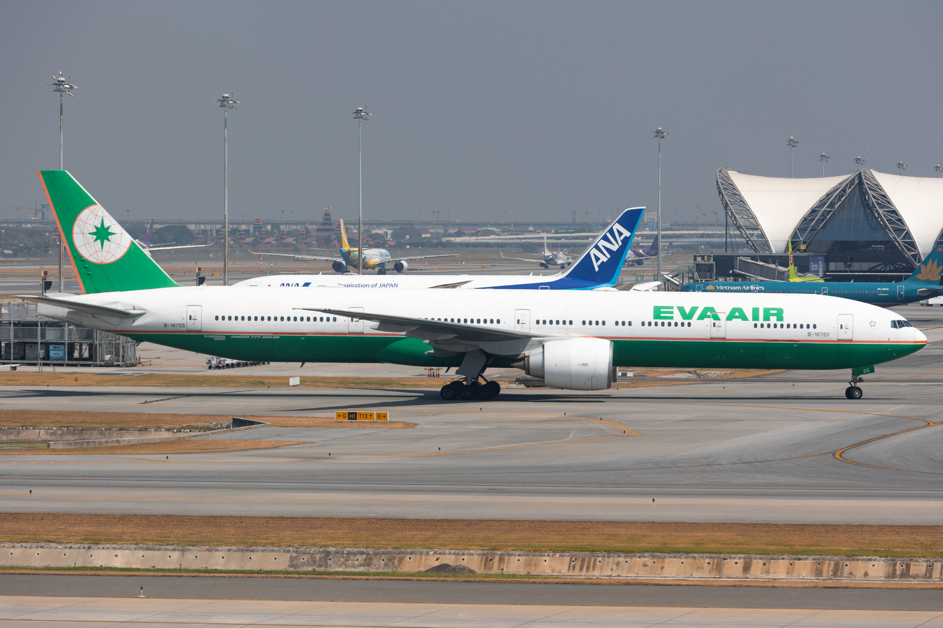 A EVA Air Boeing 777-35E(ER), registered as B-16705 taxiing to the gate