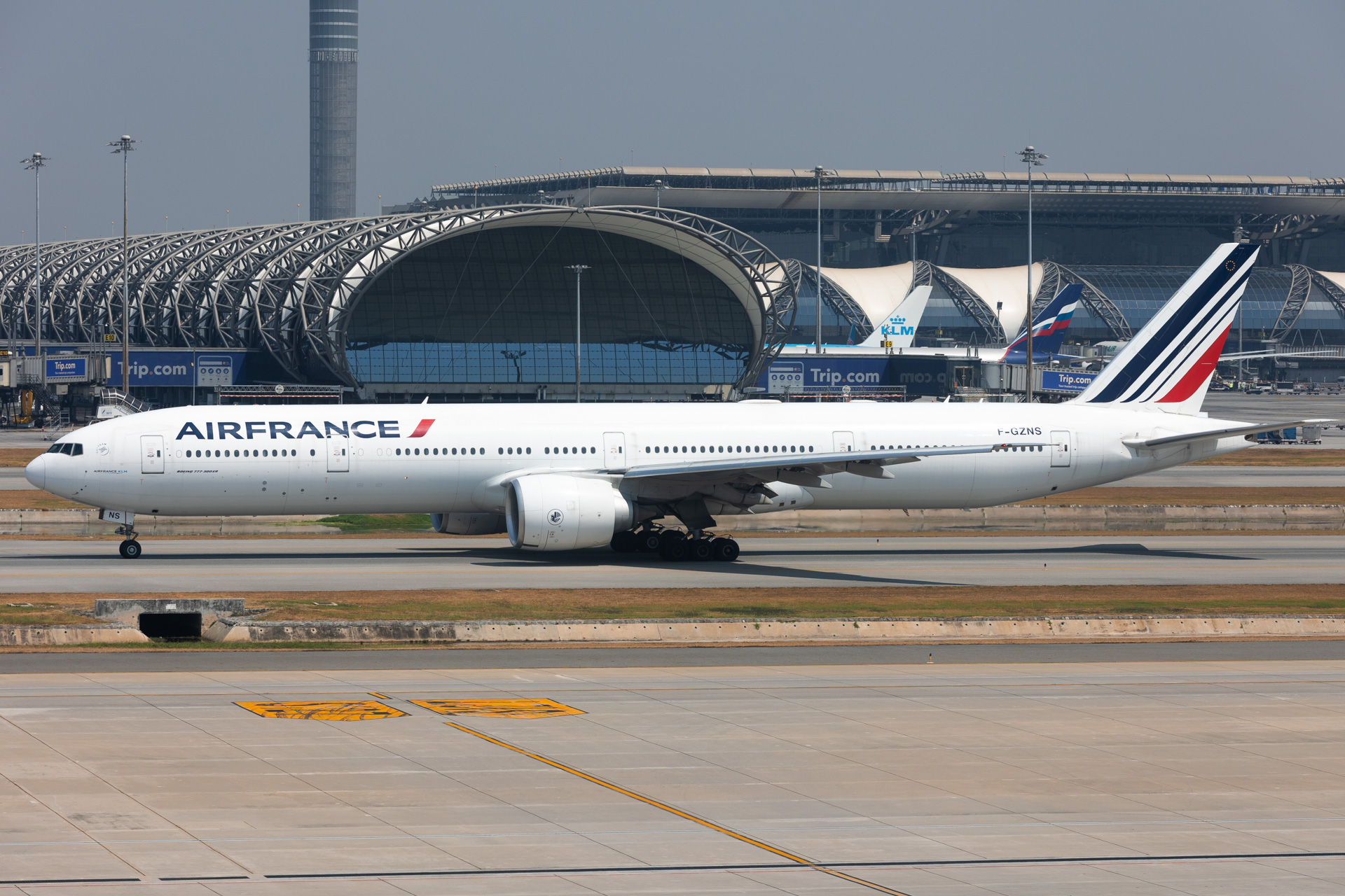 An Air France Boeing 777-328(ER), registered as F-GZNS taxiing to the active runway