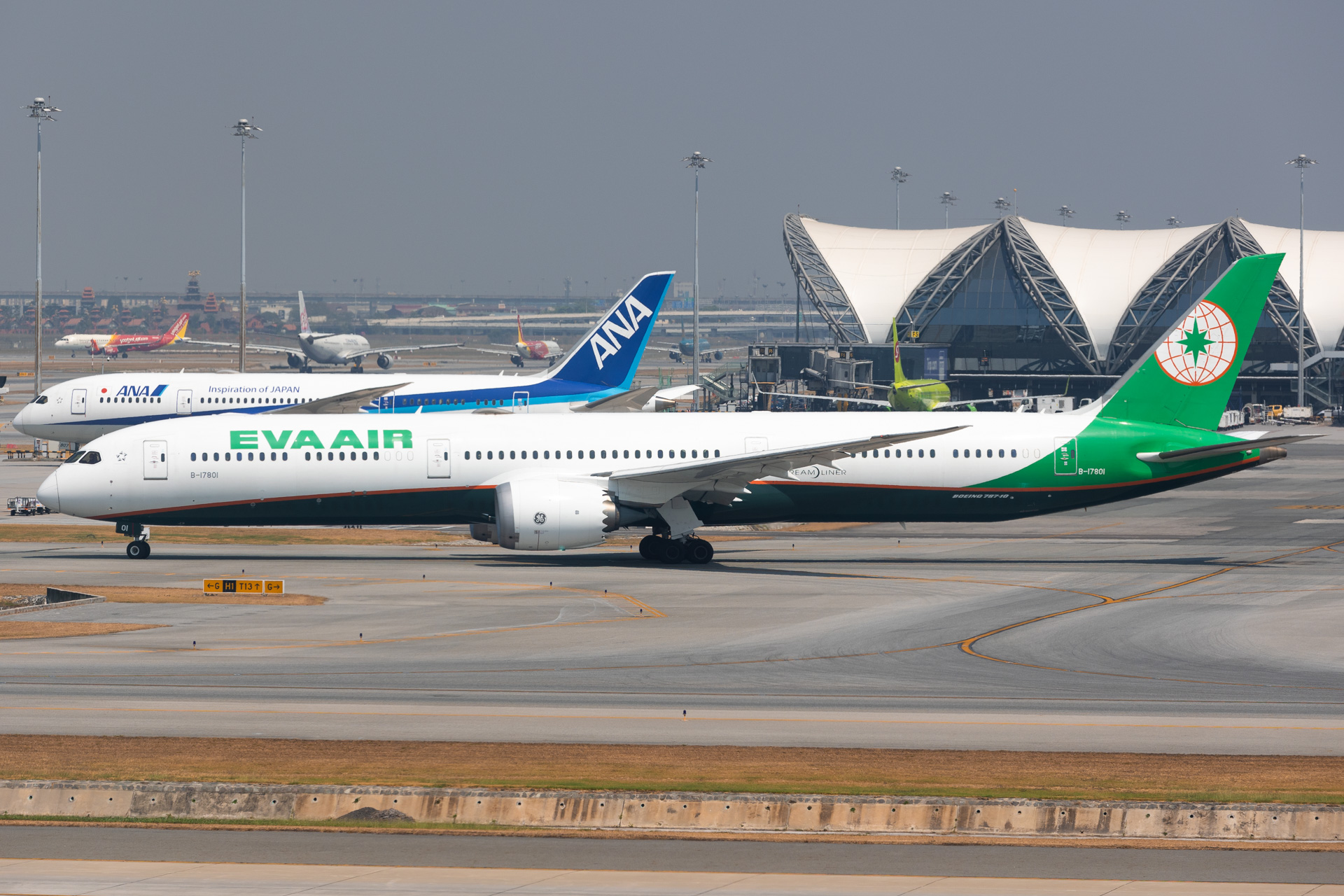 An EVA Air Boeing 787-10, registered as B-17801 taxiing to the active runway