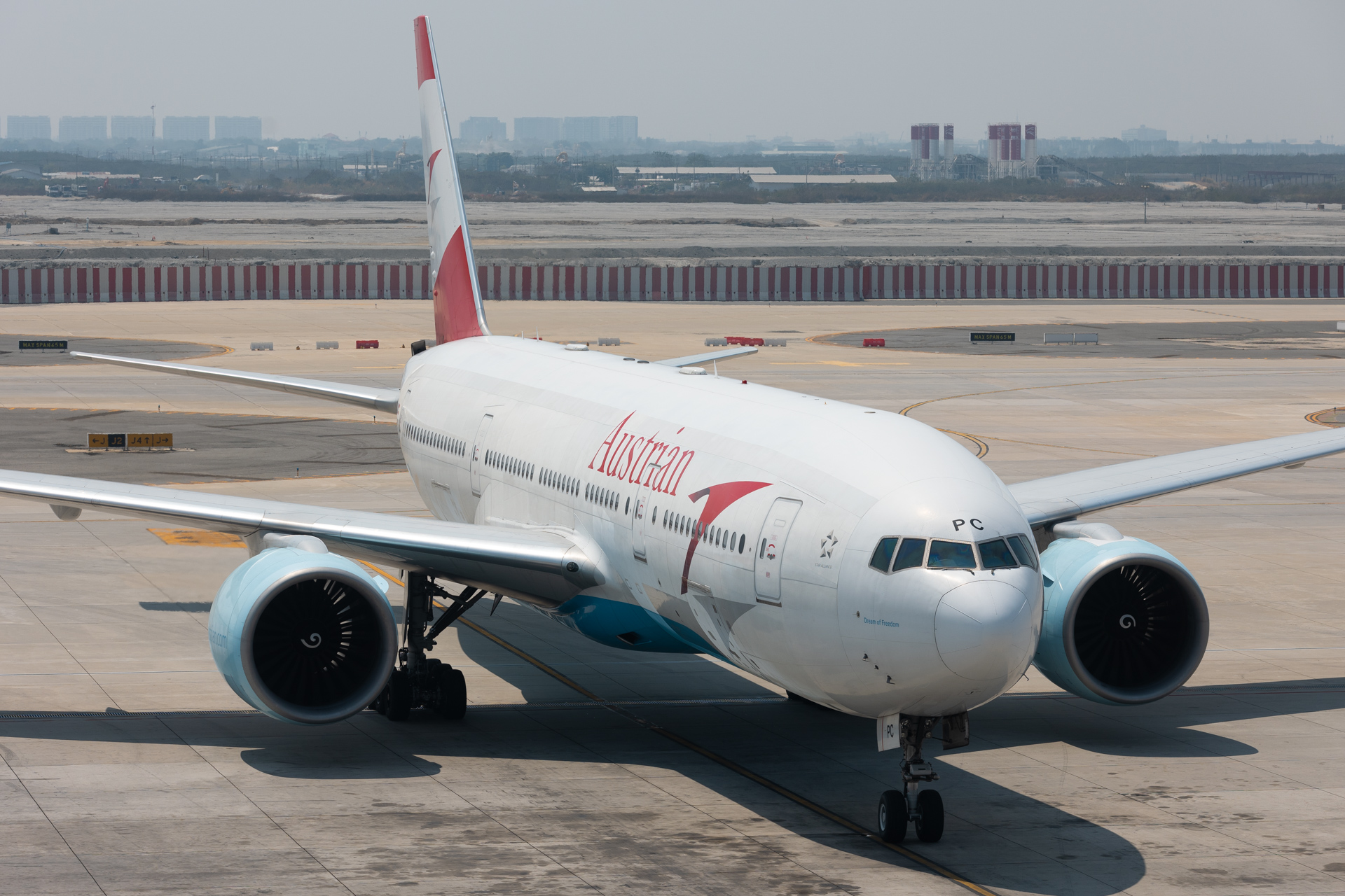 An Austrian Airlines Boeing 777-2Z9(ER), registered as OE-LPC taxiing to the gate