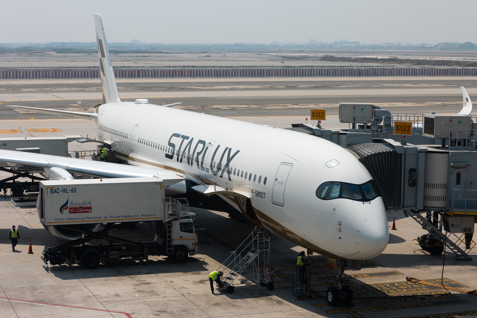 A Starlux Airbus A350-941, registered as B-58507 at the gate. I was very excited to spot this one, what a beautiful livery!
